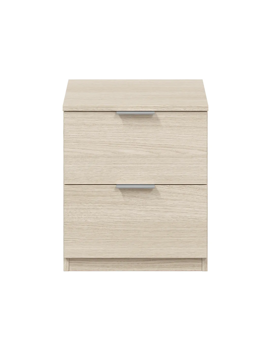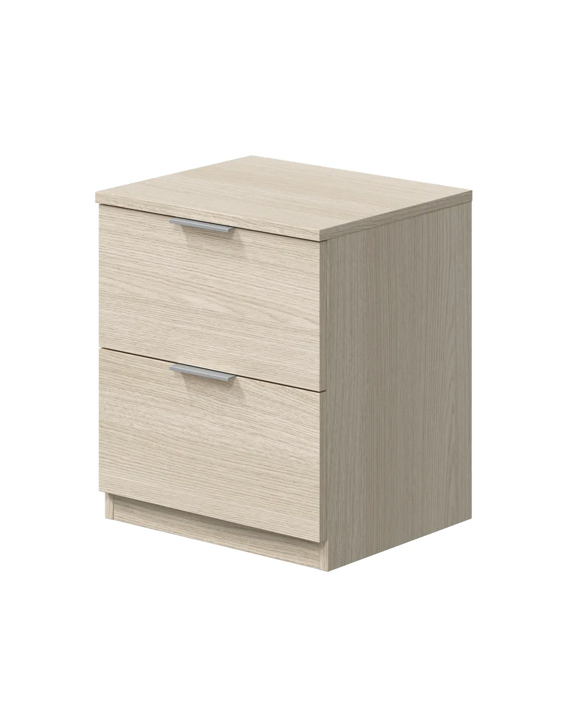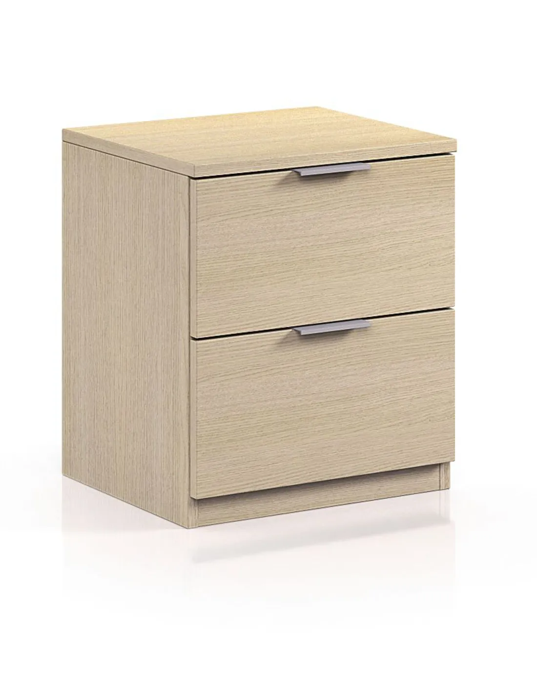 Mesita con dos cajones, ideal como complemento para el dormitorio, ofreciendo espacio práctico para organizar objetos personales.