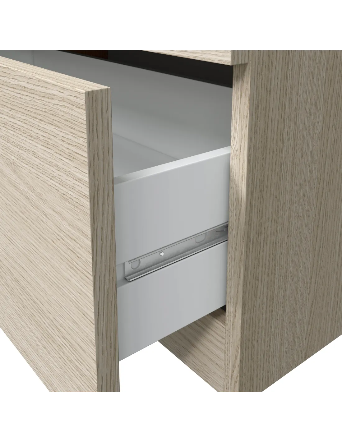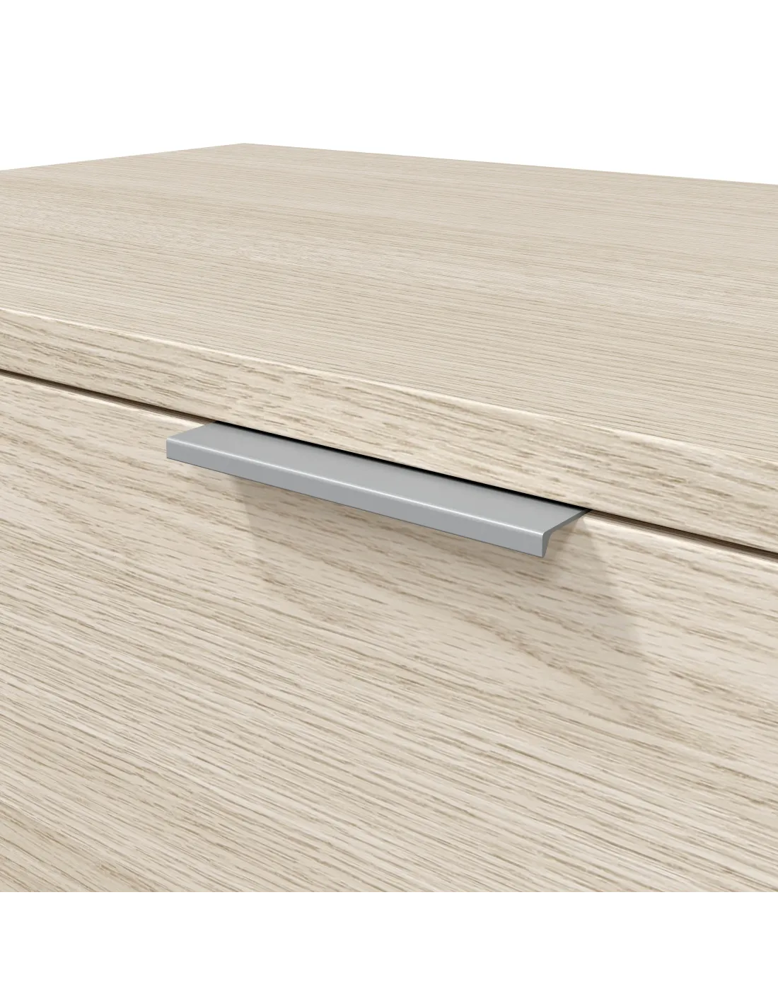 Dispone de guías correderas metálicas para los cajones (no extraíbles) y tacos ABS (termoplástico de alta resistencia) quitarruidos y antirayas para la parte inferior del mueble. Incorpora tiradores de aluminio.