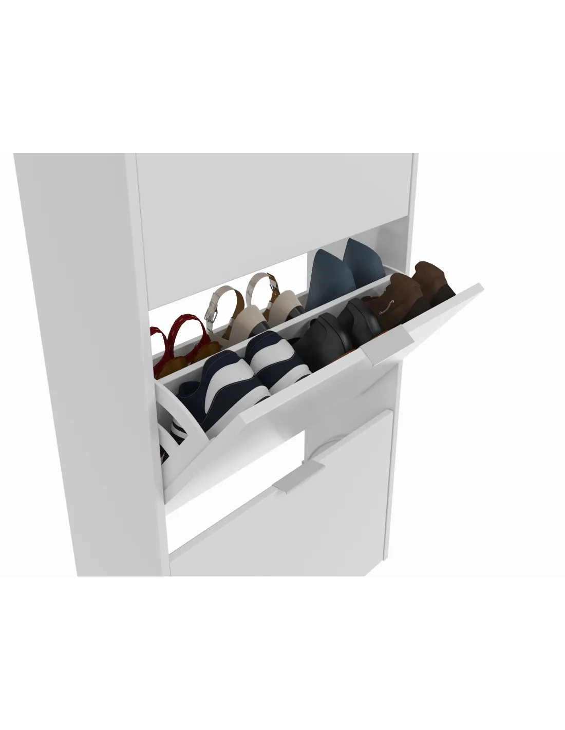 Zapatero de 3 puertas abatibles con capacidad de 18 pares de zapatos aproximadamente.
