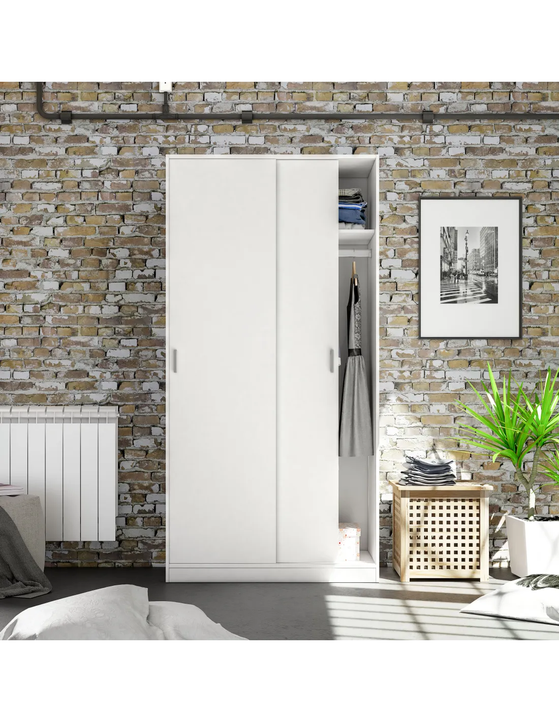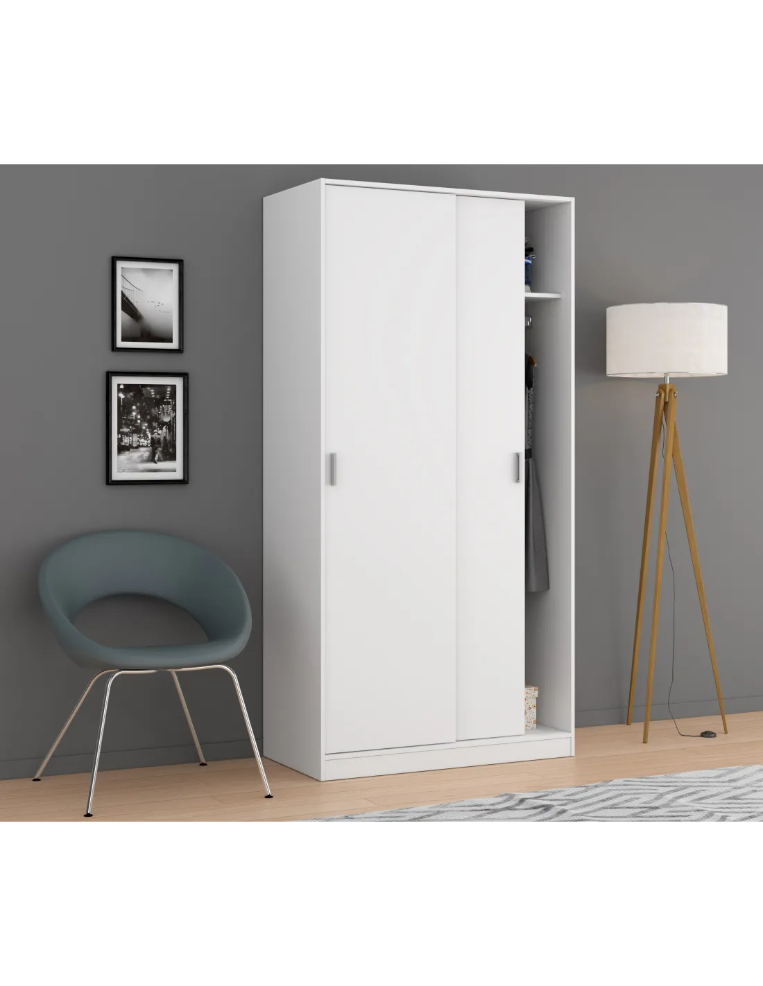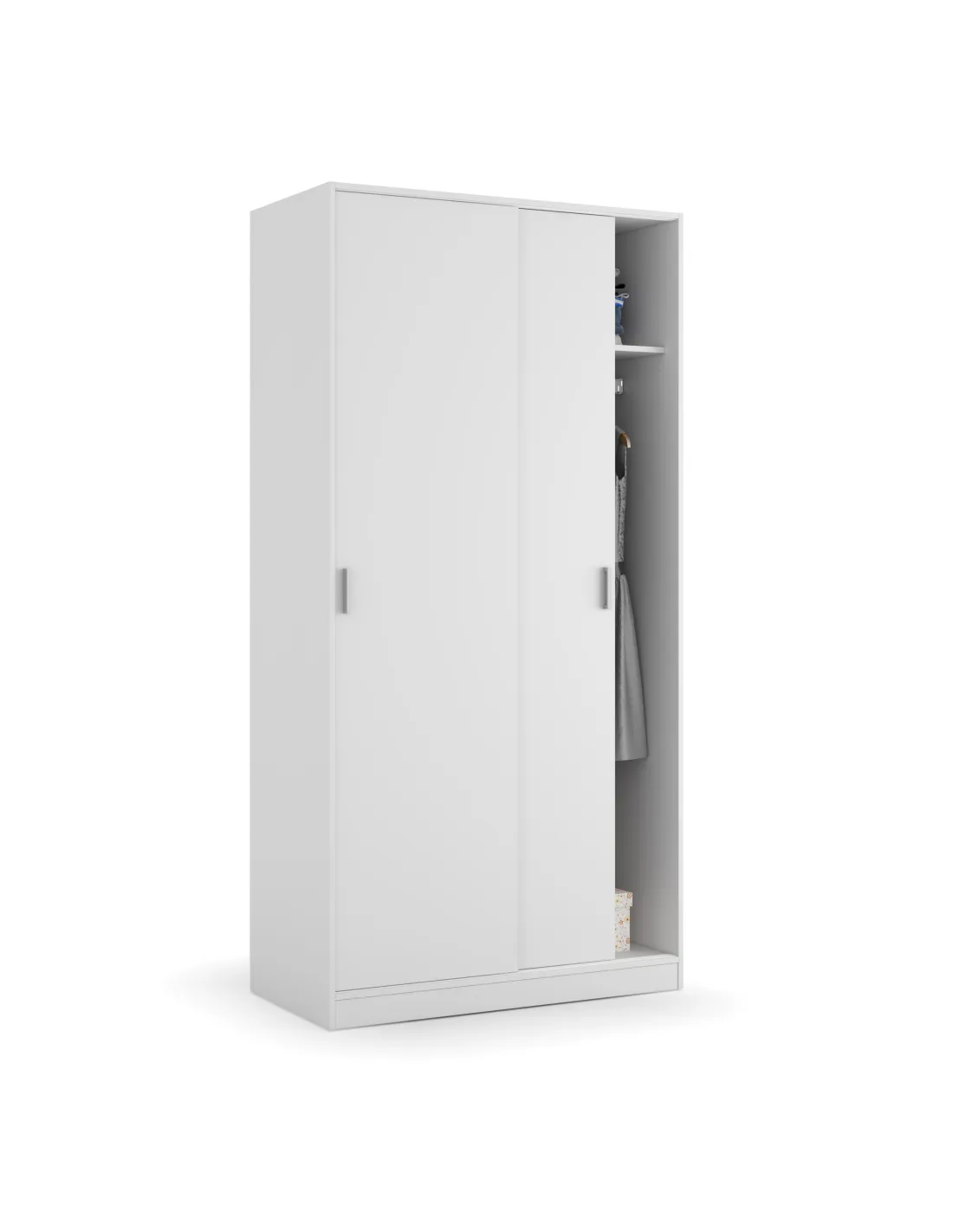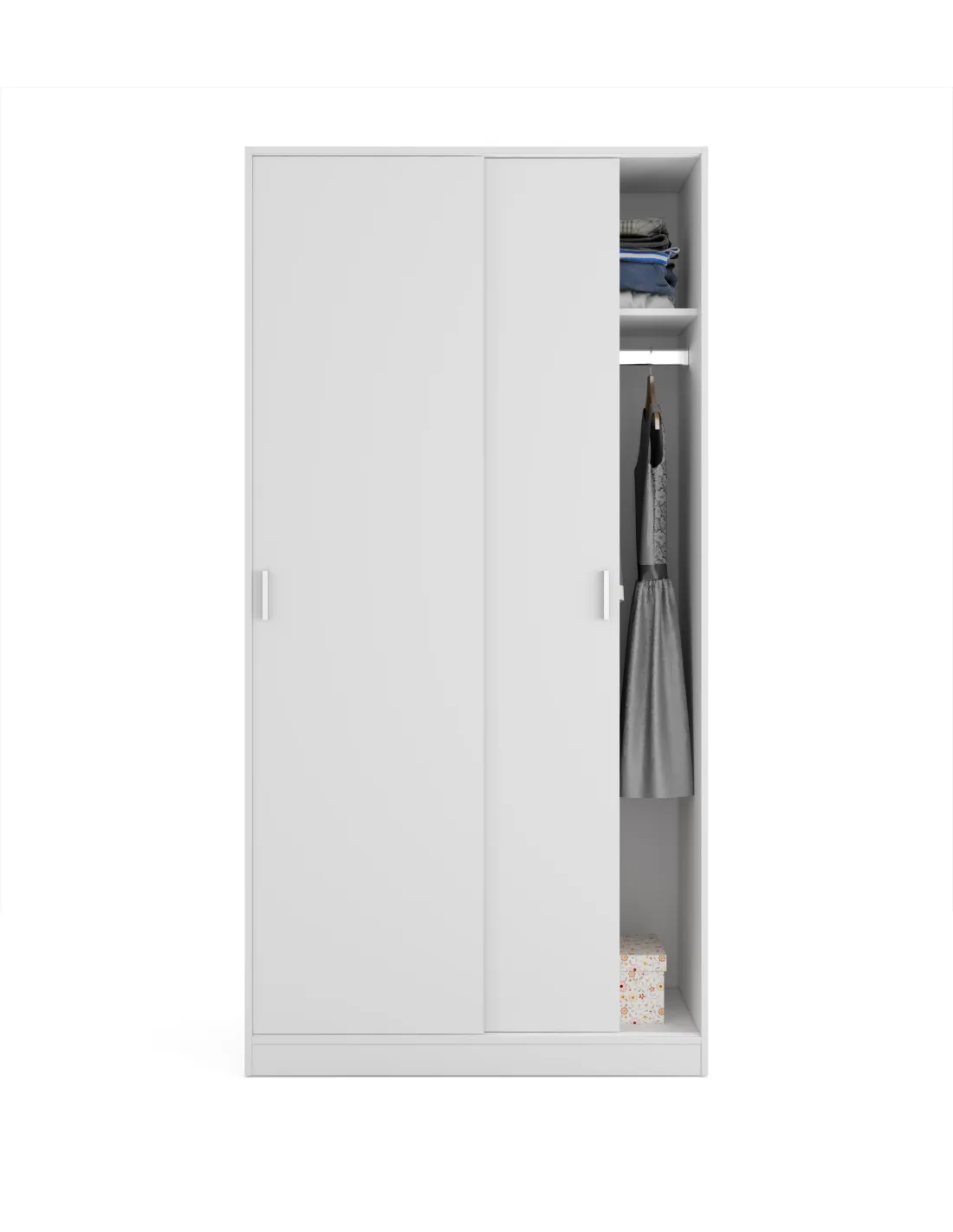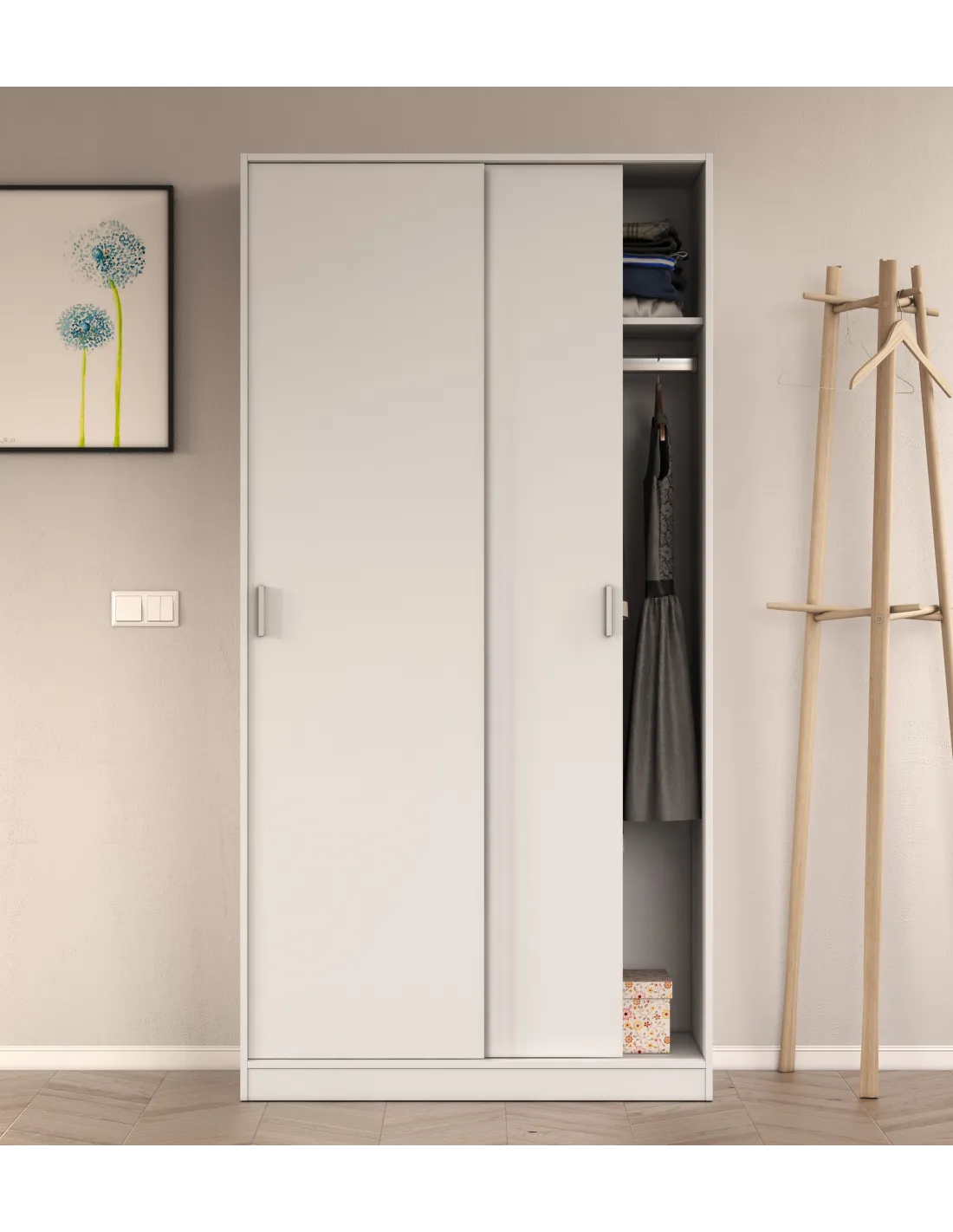 Armario de 2 puertas correderas con barra de colgar y un estante en su interior, ideal para organizar ropa y complementos en el dormitorio.