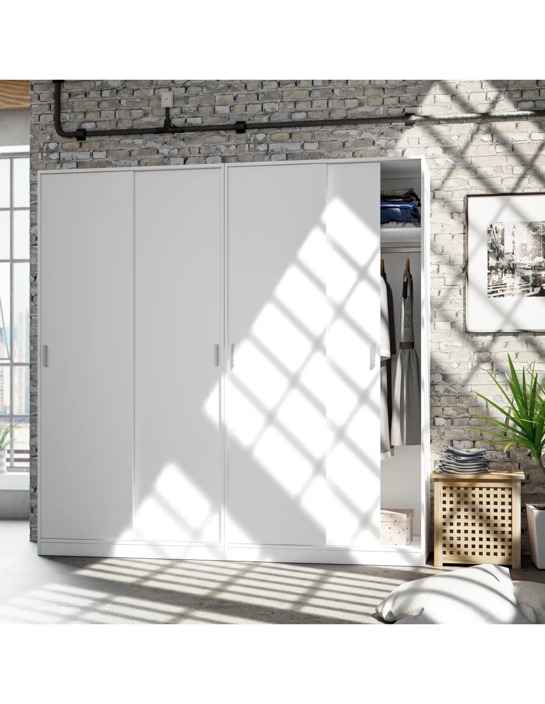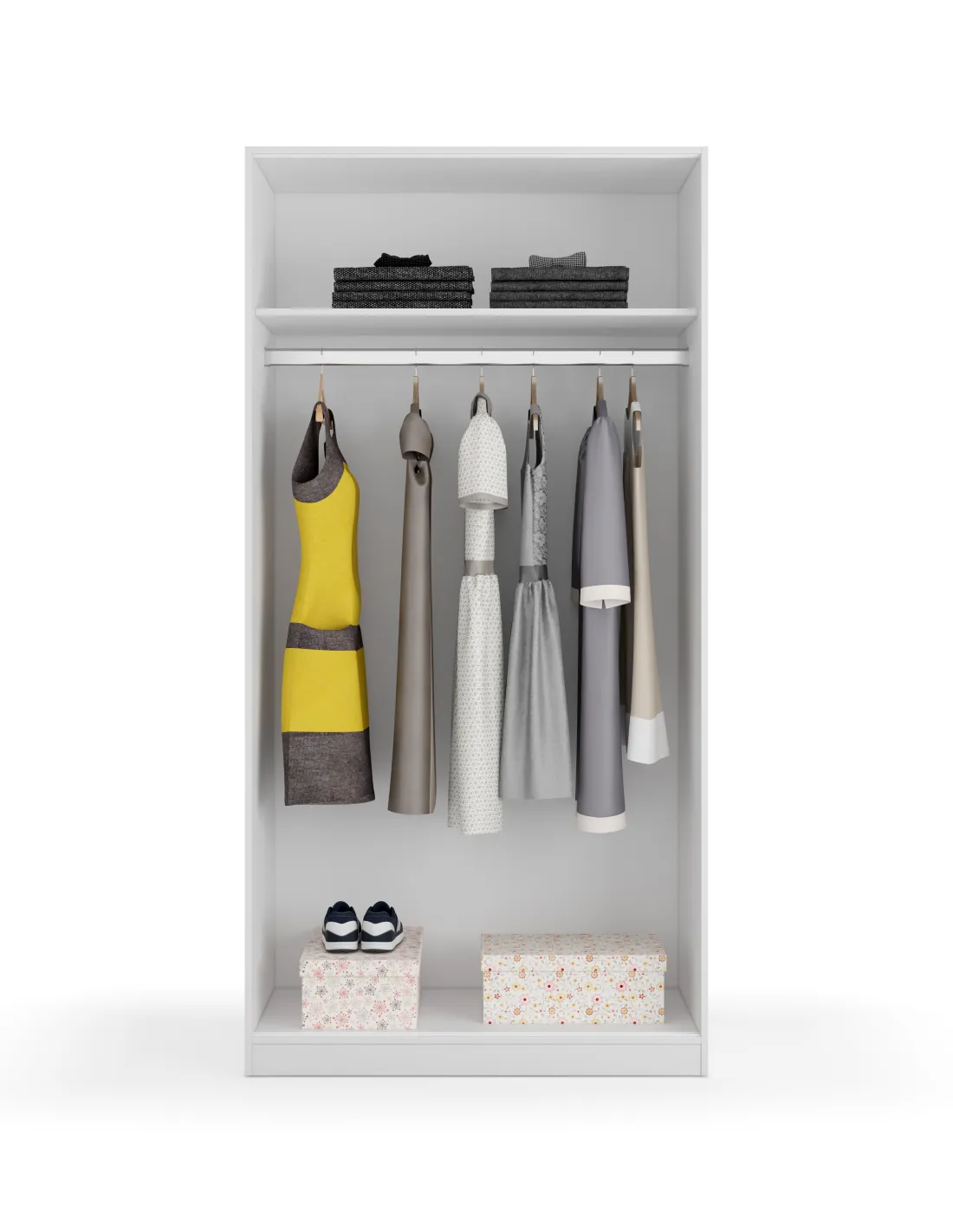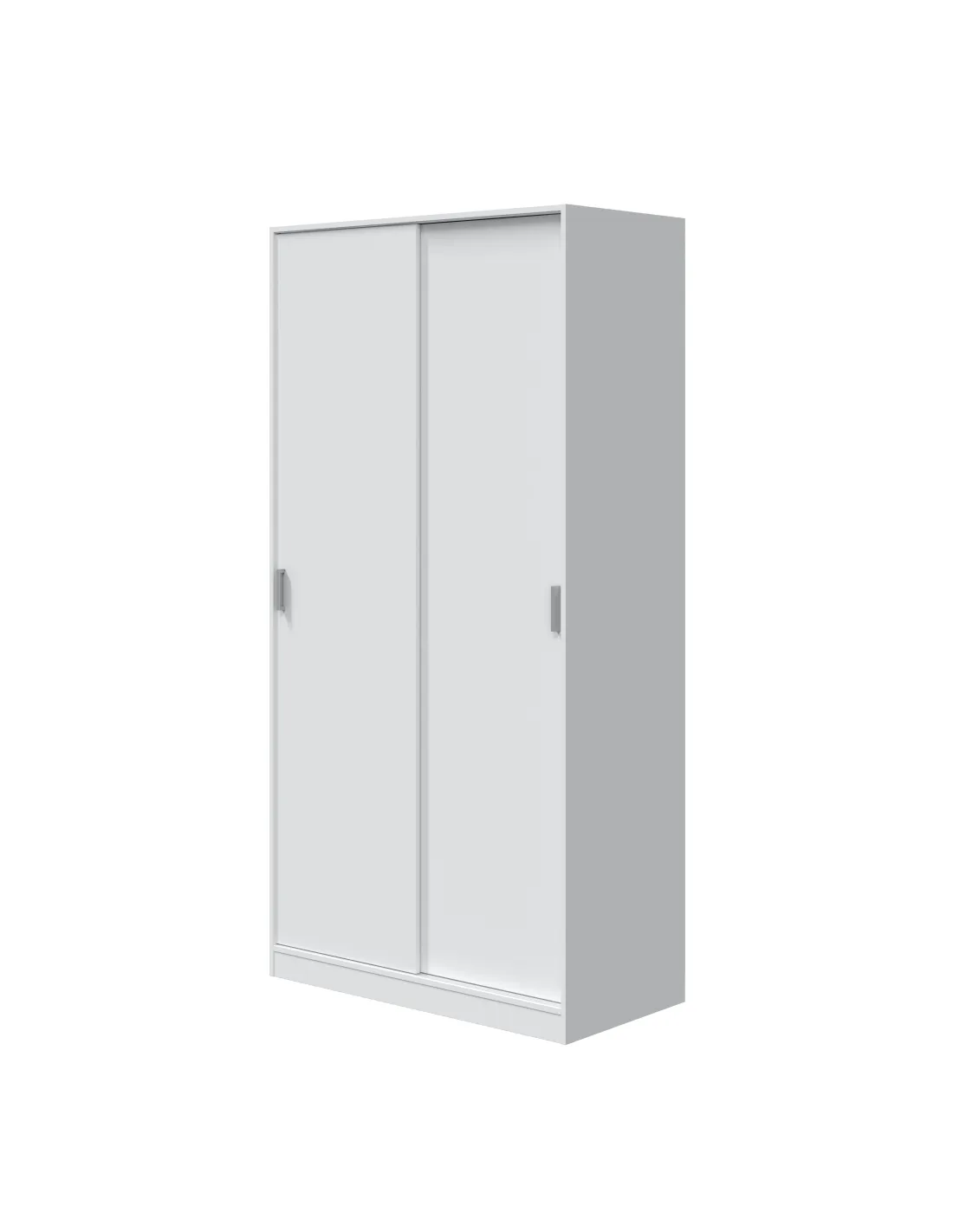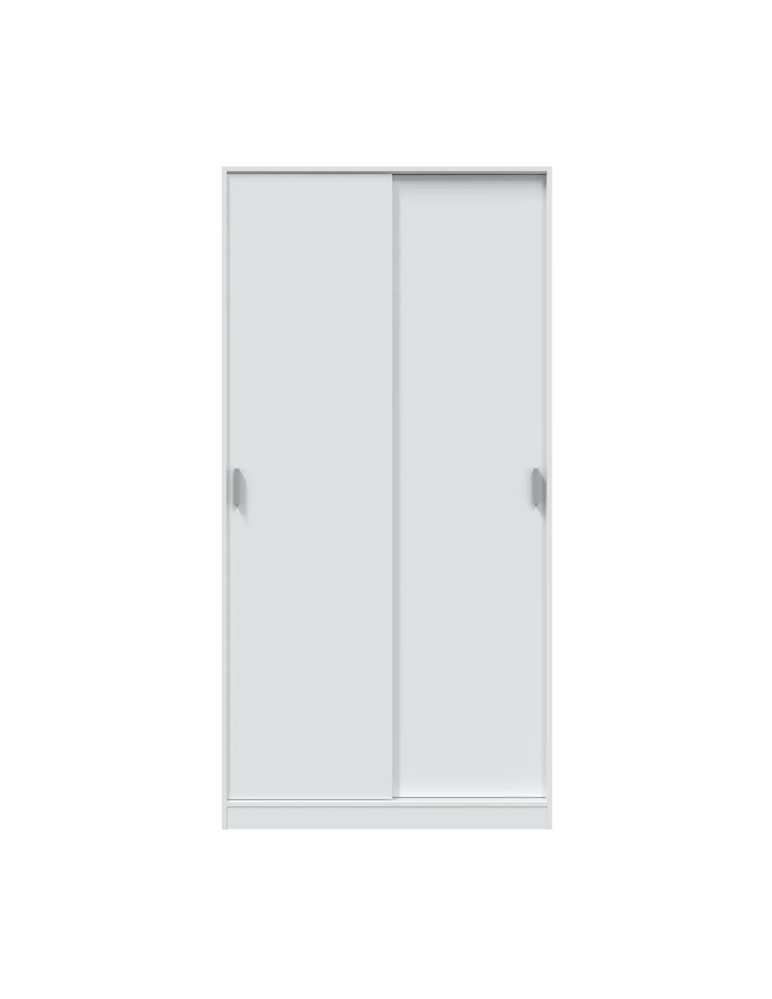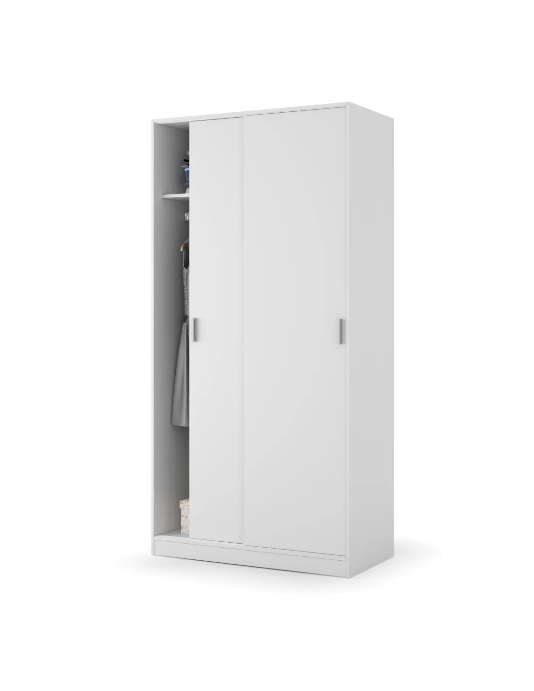Incorpora barra de colgar de aluminio extraíble, guías correderas ABS para las puertas y tiradores ABS pintados en gris aluminio. Dispone de tacos ABS quitarruidos y antirayas para la parte inferior del mueble. El interior está acabado en blanco.