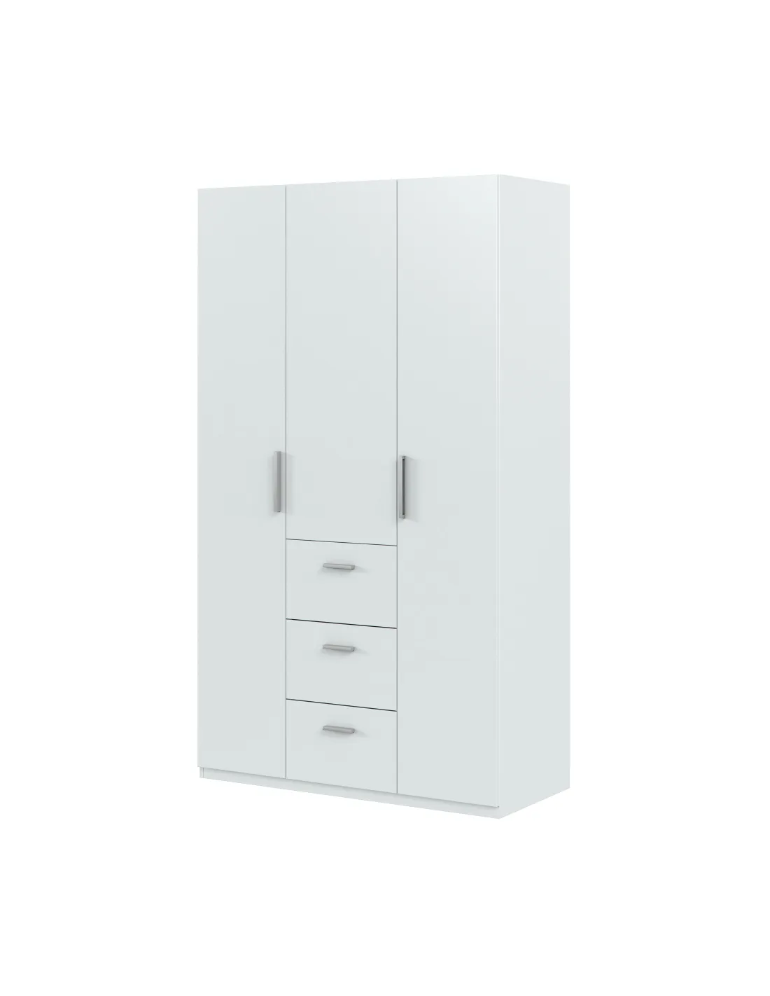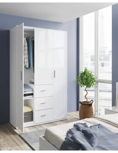 Armario de 3 puertas con barra de colgar y estantes en su interior, acompañado de 3 cajones inferiores, ideal para organizar ropa y complementos en el dormitorio.