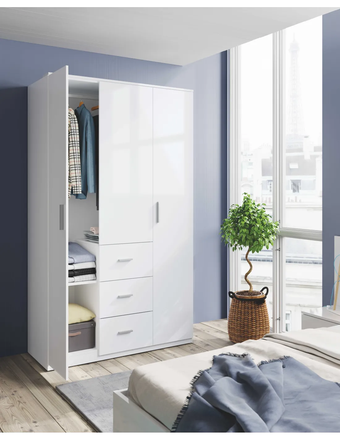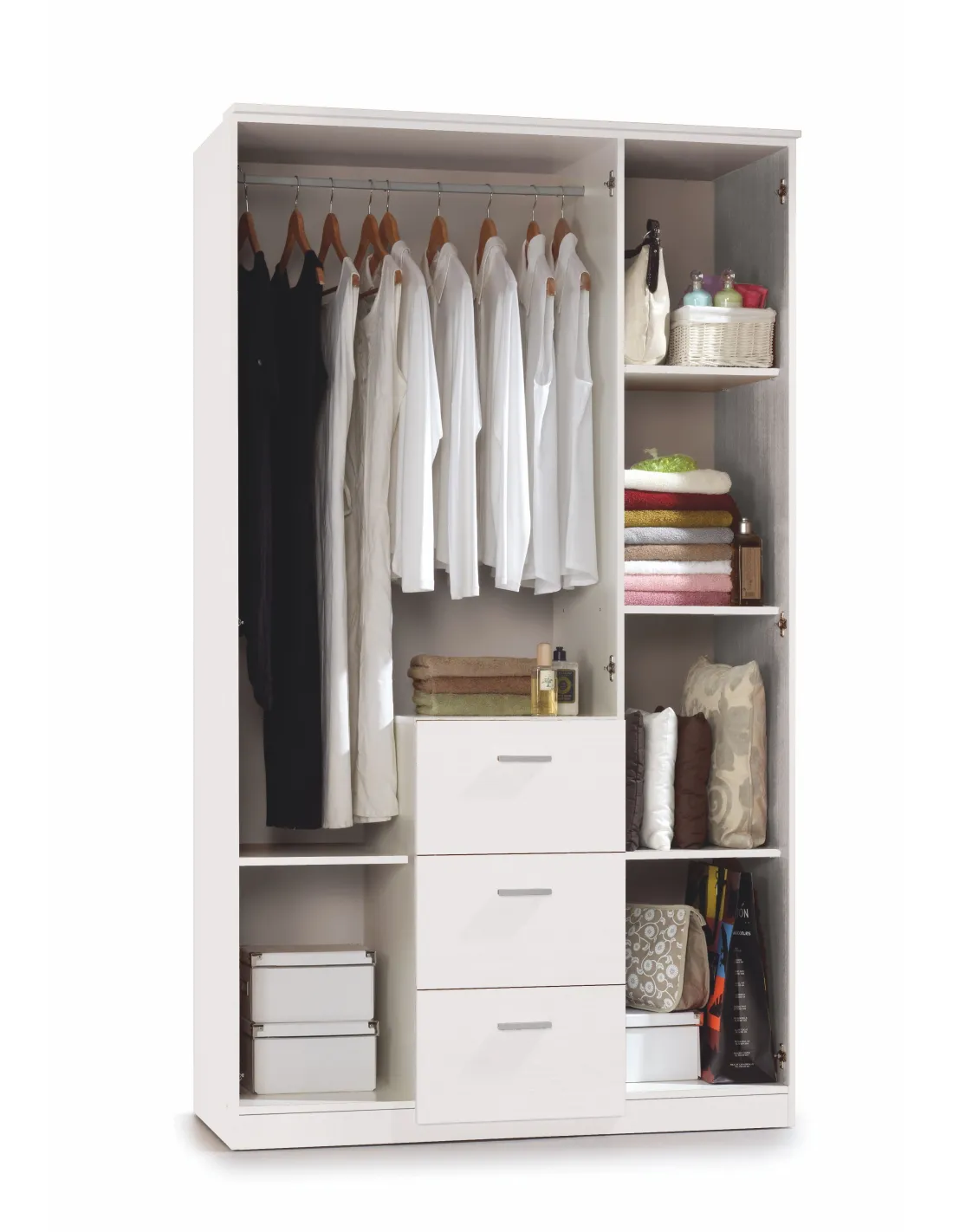 Armario de 3 puertas con barra de colgar y estantes en su interior y 3 cajones inferiores.