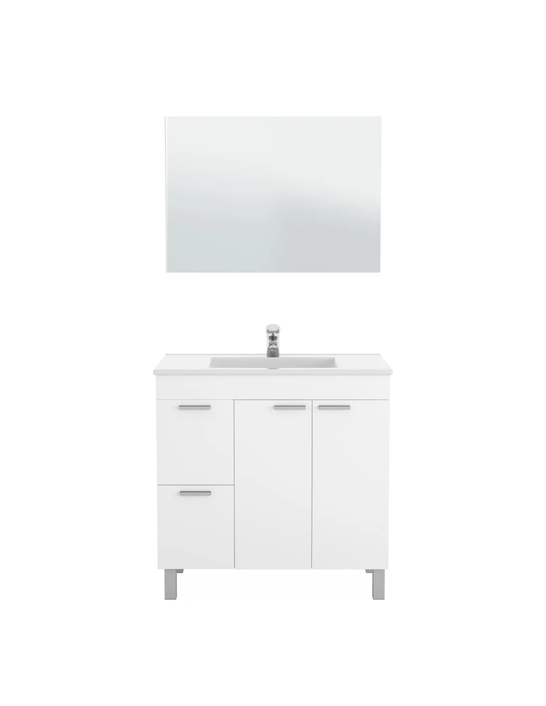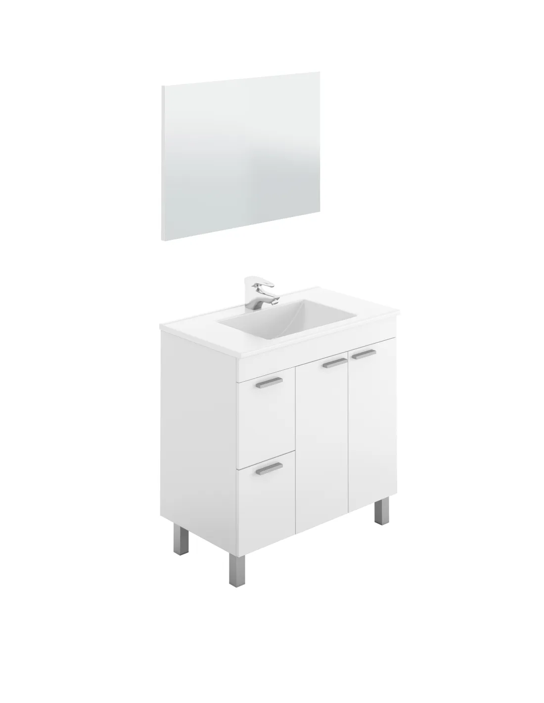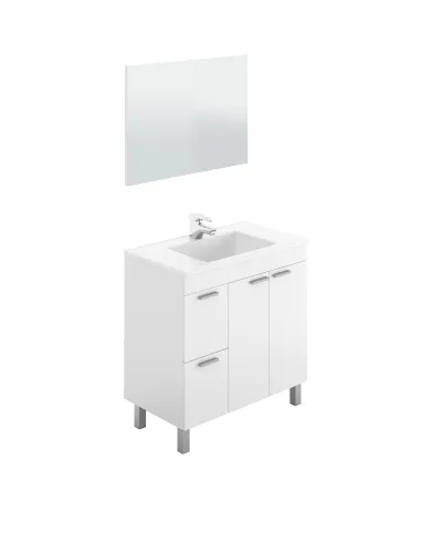 Mueble de baño con 2 cajones y 2 puertas, con 4 patas. Incluye espejo del mismo acabado para un conjunto coordinado.