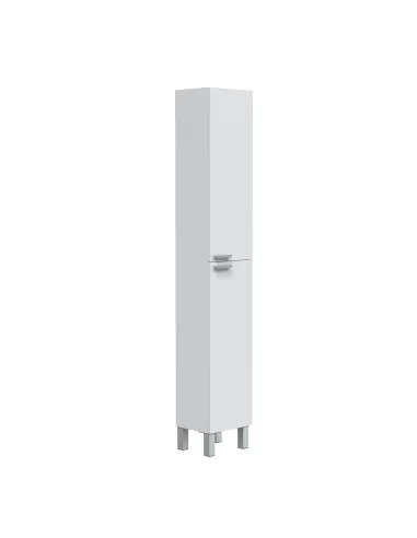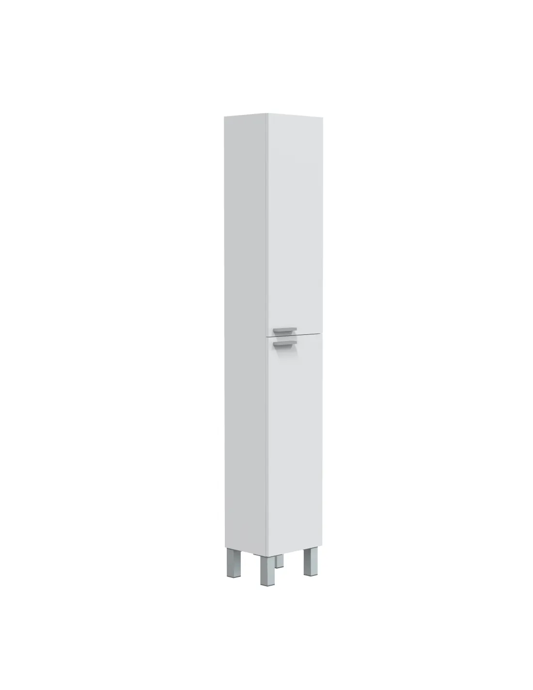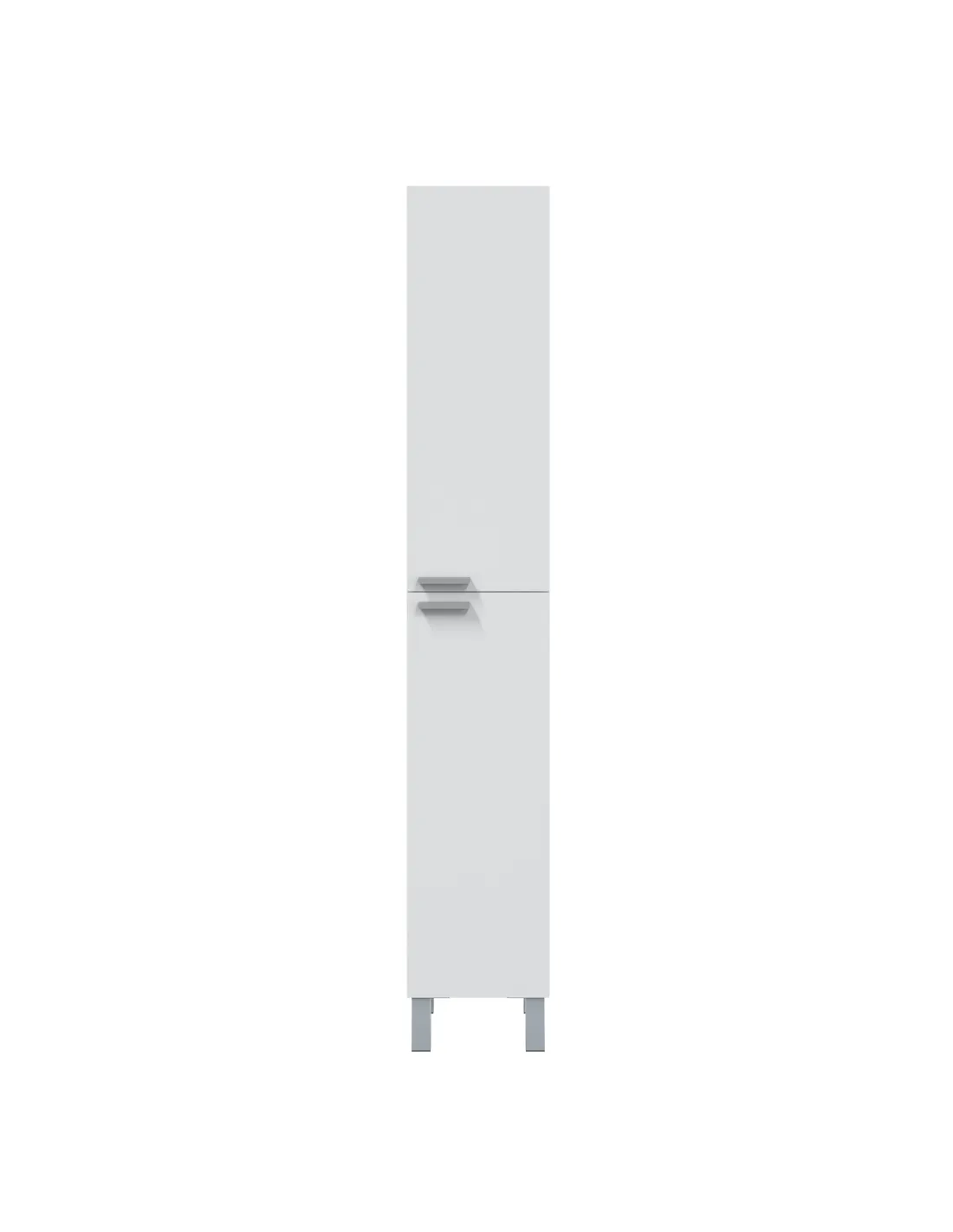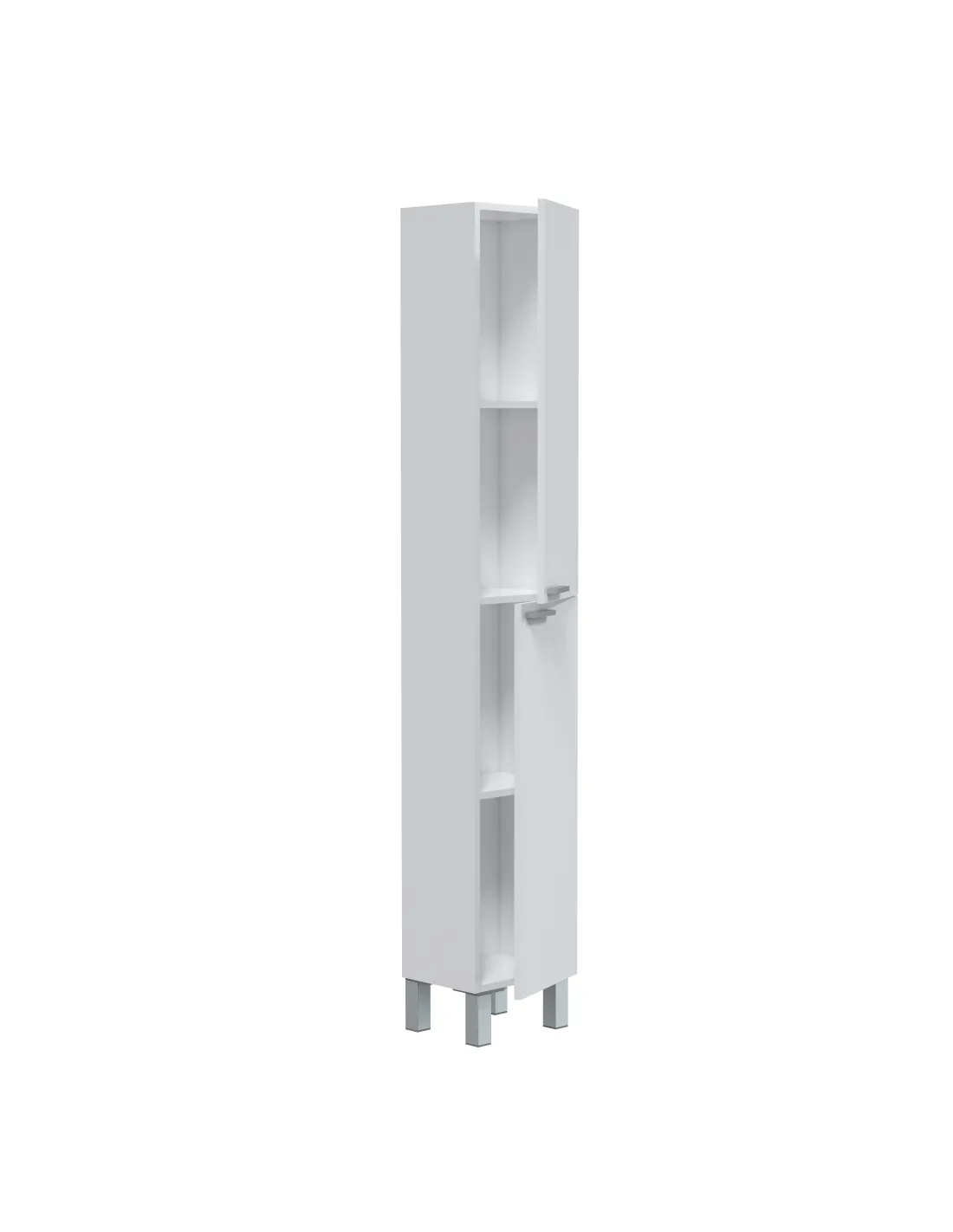 Columna de baño con 2 puertas y 4 patas. Dispone de soporte para estantes metálicos, ofreciendo almacenamiento práctico y ordenado.