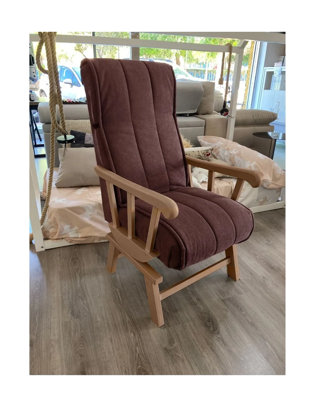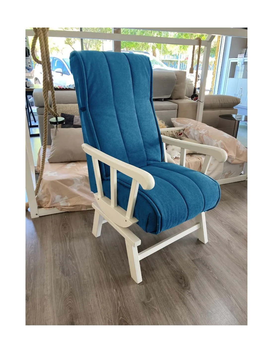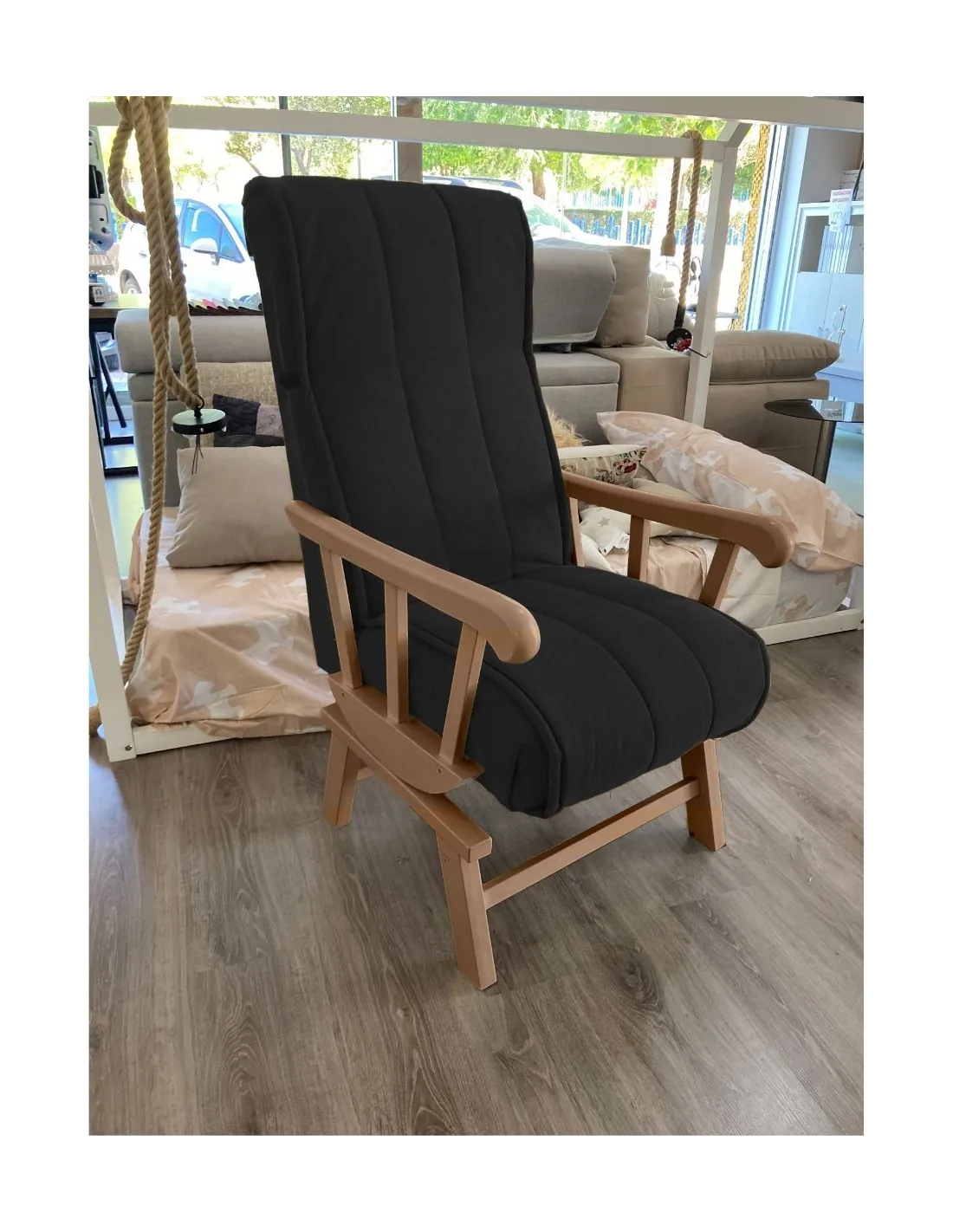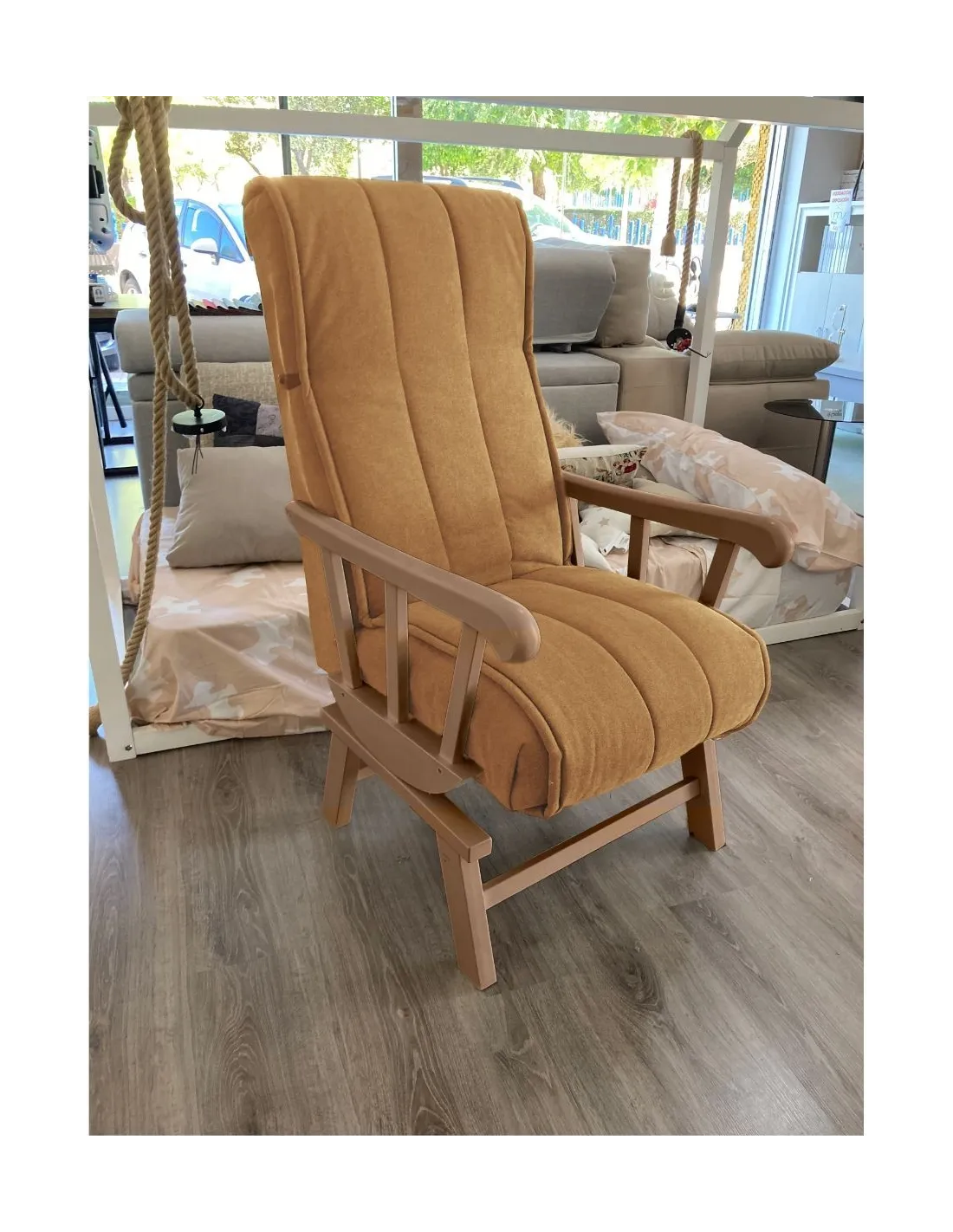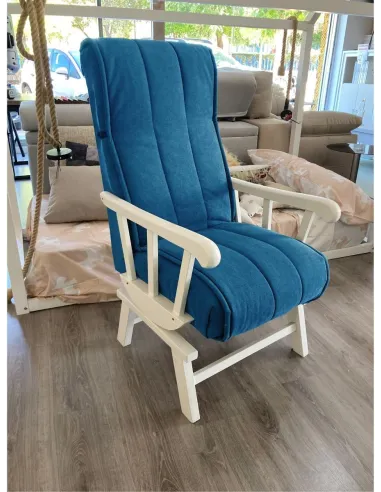 Increíble butaca mecedora de estilo clasico y gran confort que presenta un respaldo con orejeras para garantizar el confort y el descanso.