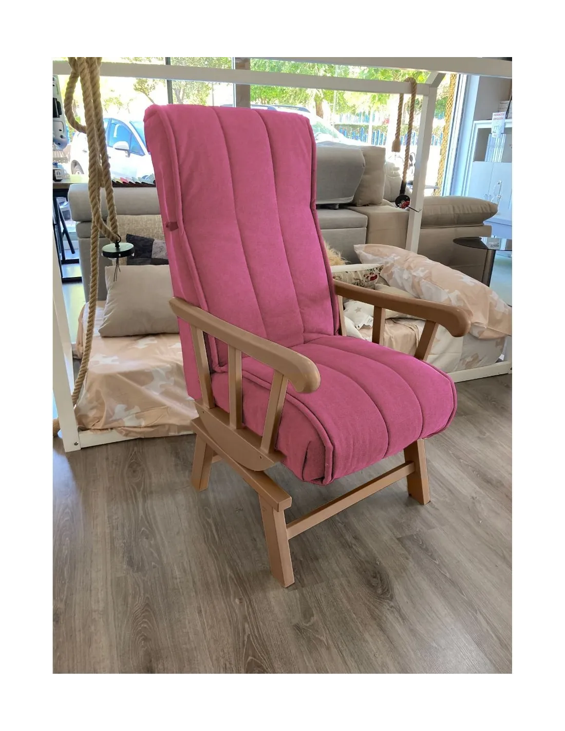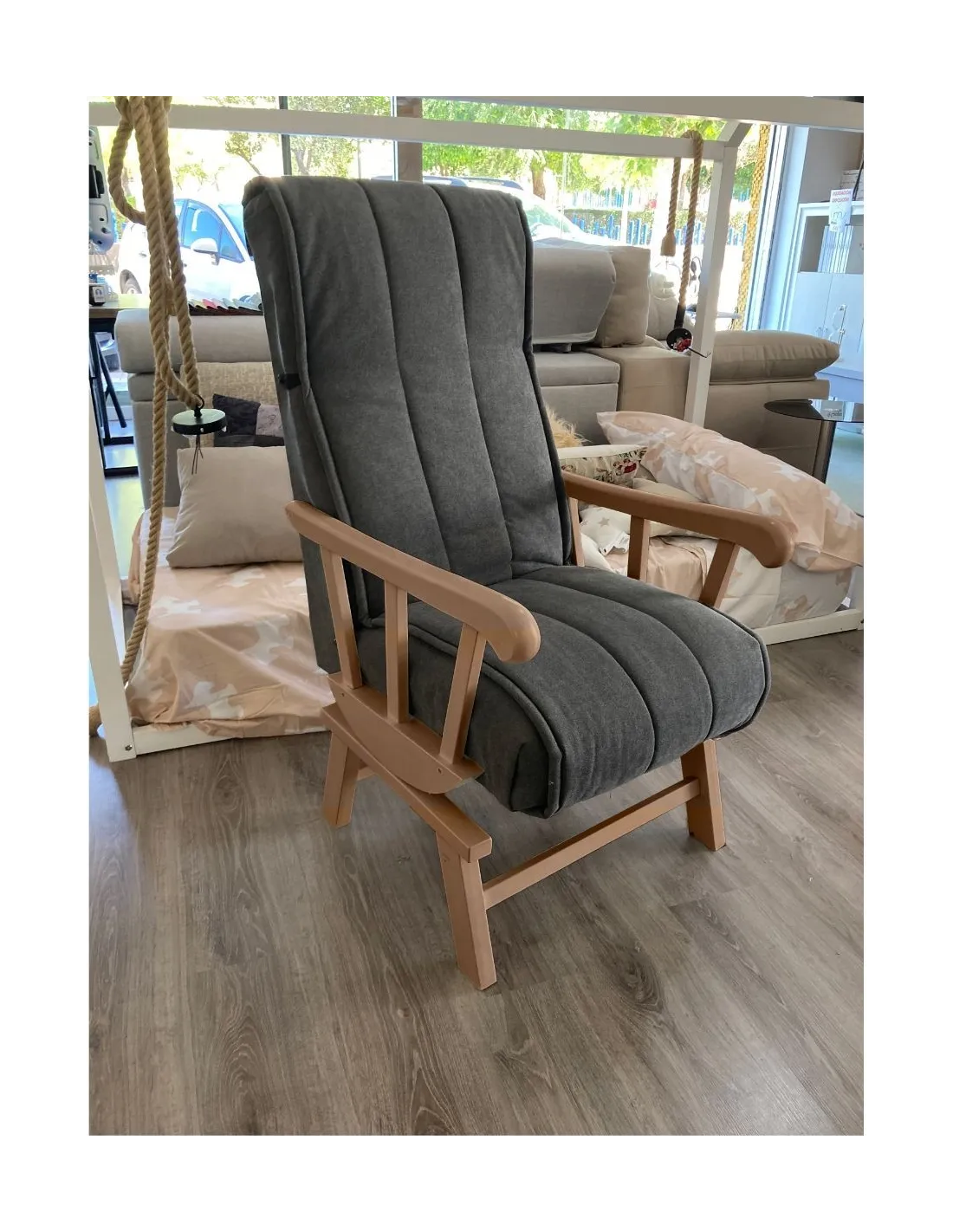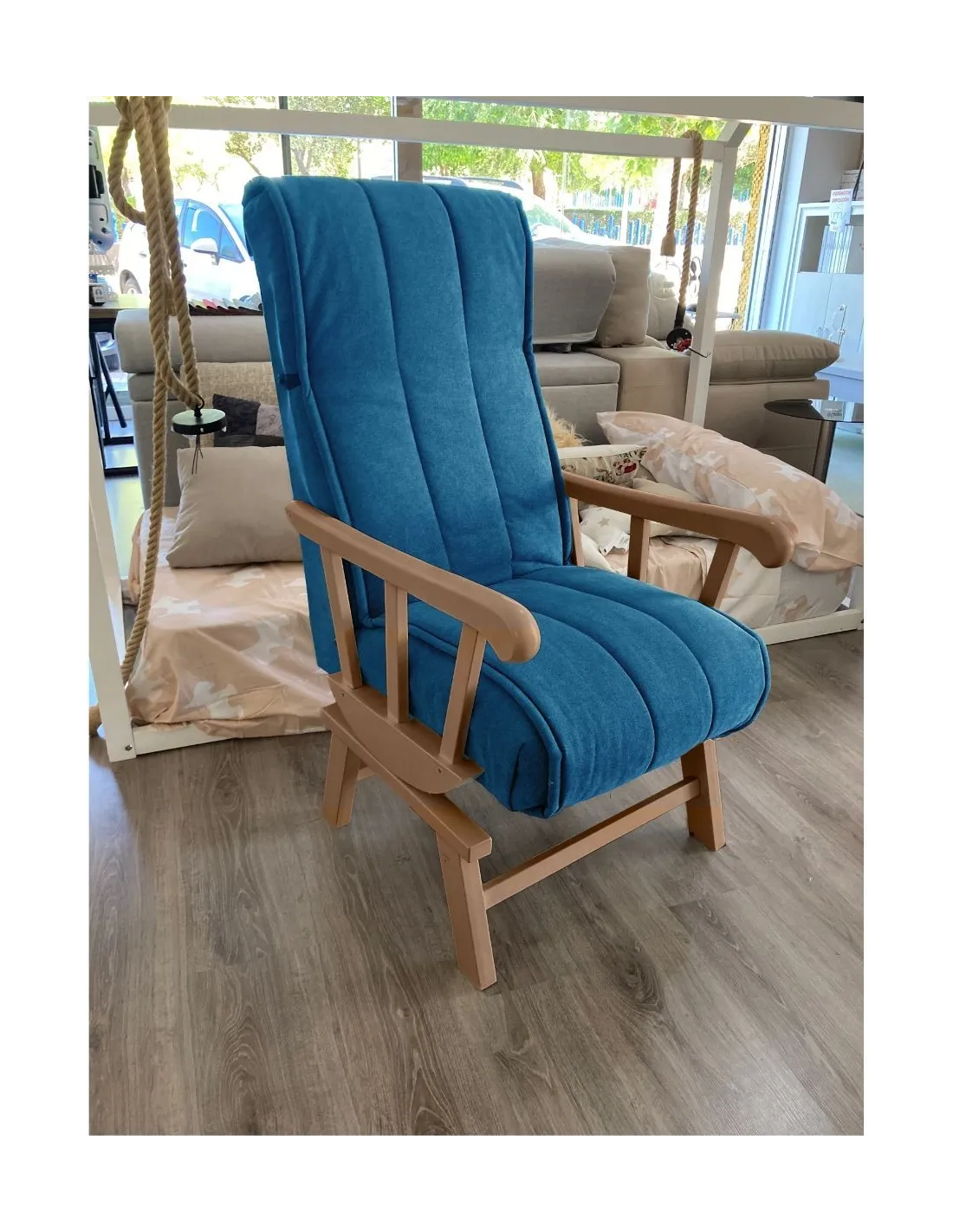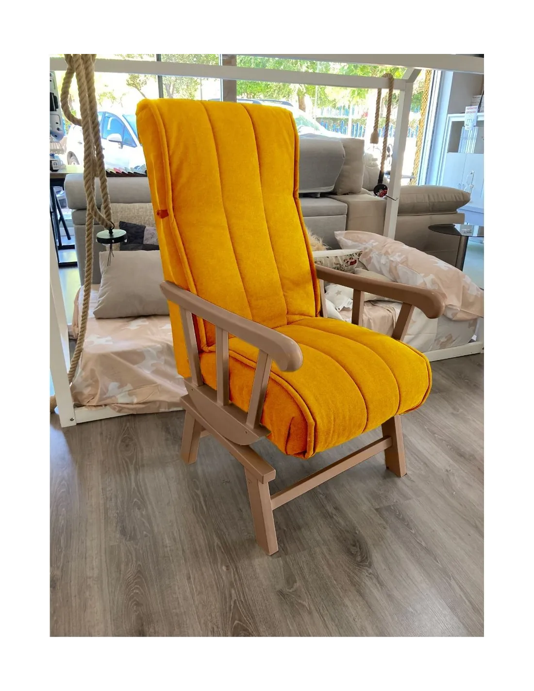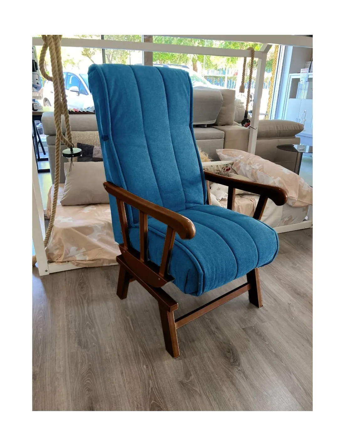 Increíble butaca mecedora de estilo clasico y gran confort que presenta un respaldo con orejeras para garantizar el confort y el descanso.