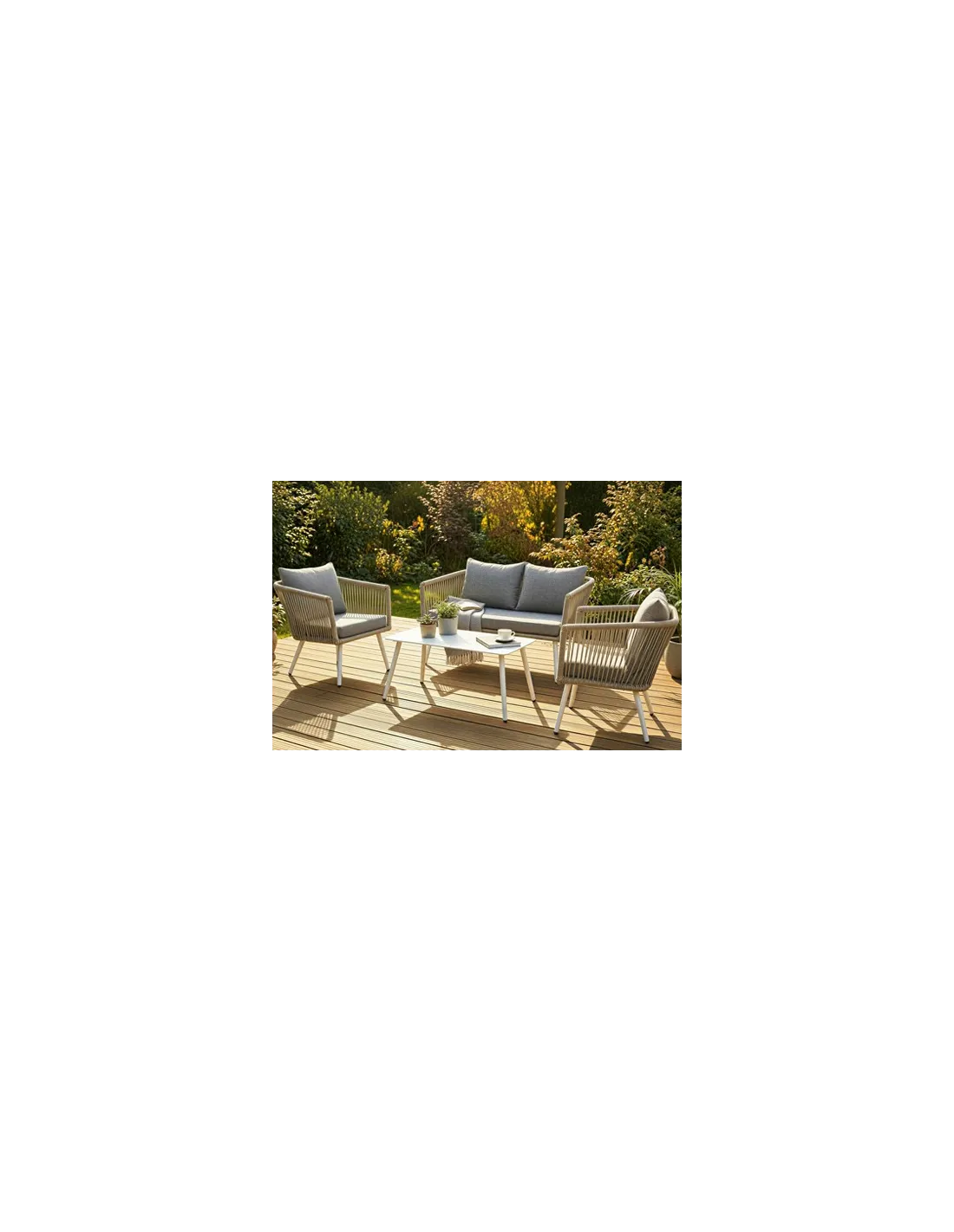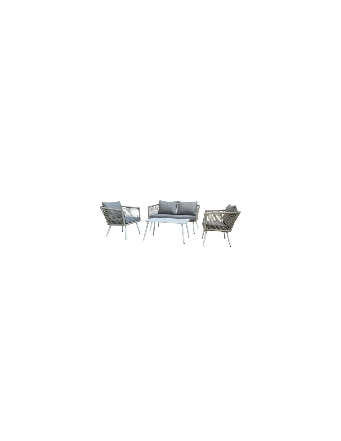 Conjunto de exterior Compuesto por 1 sofá 2 plazas, 2 sillones 1 plaza y mesa de centro Estructura en aluminio Rattán sintético Cojines en tejido de poliester Tapa mesa en cristal templado Sofa 2 pl : 136 x 71 x 69 cm Sillón 1 pl : 62 x 71 x 69 cm Mesa centro : 90 x 50 x 42 cm - Unidad venta : caja 1 Ud - Volumen : 0 634 M 3 x Ud Entradas previstas : Colores disponibles : Rattán marron En stock : 124 Uds En stock : 124 Uds