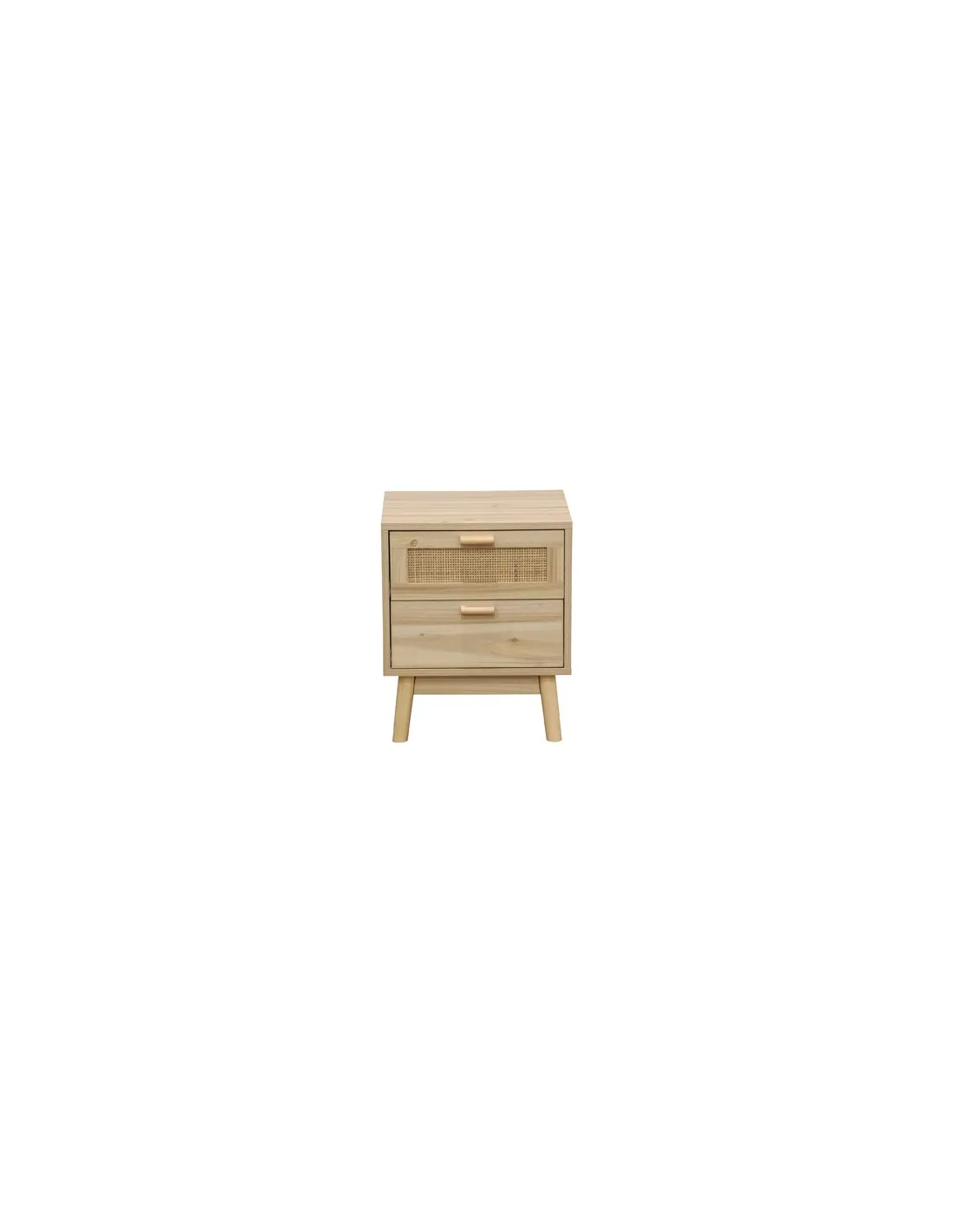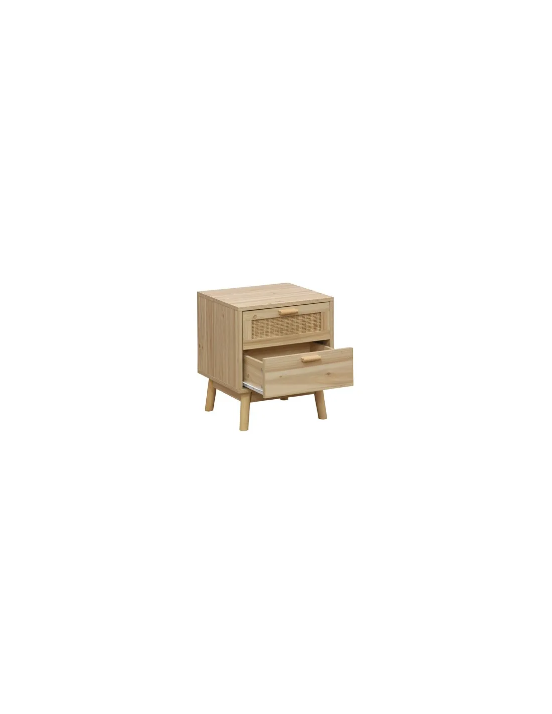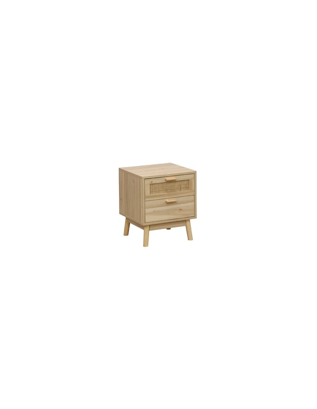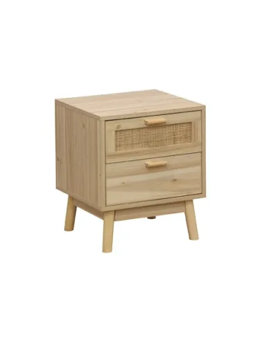 Mesilla de noche con patas 2 cajones con guias metálicas 1 cajón con frente en rattan decorativo Papel laminado Patas en madera Medidas: 40 x 39 x 48 cm - Unidad venta : caja 1 Ud - Volumen : 0 026 M 3 x Ud Entradas previstas : Colores disponibles : Fresno En stock : 77 Uds En stock : 77 Uds