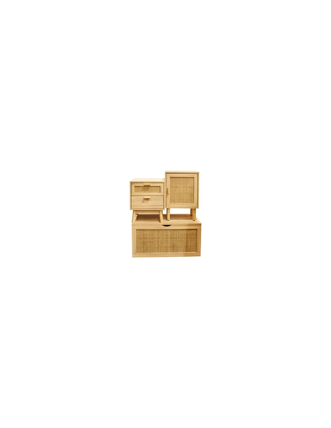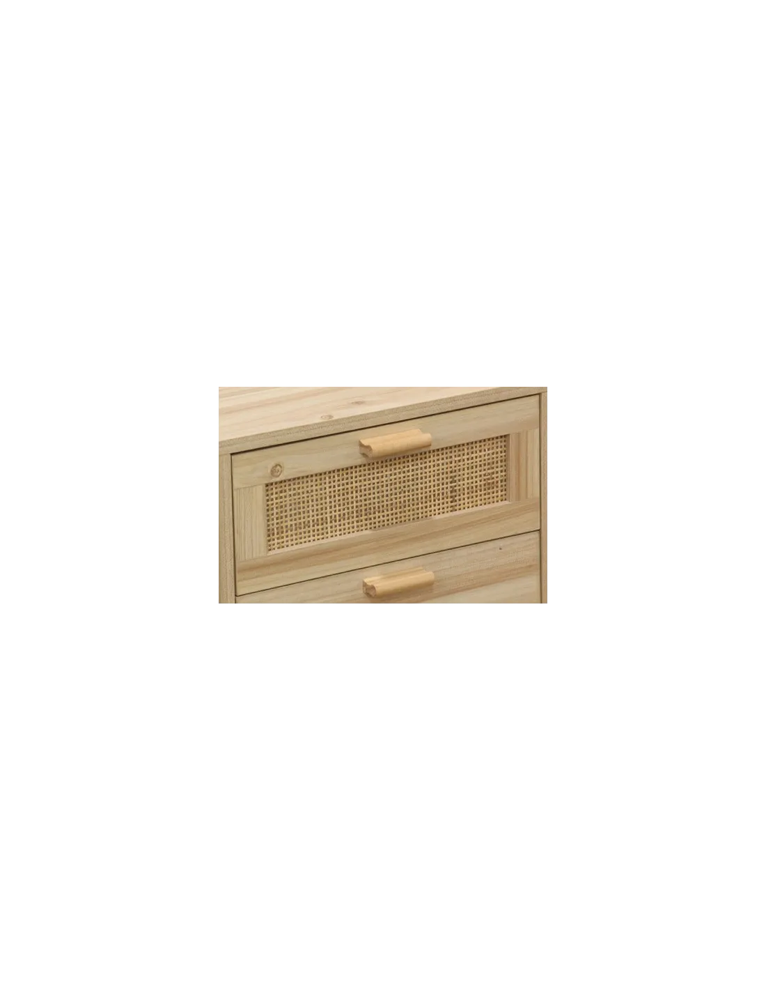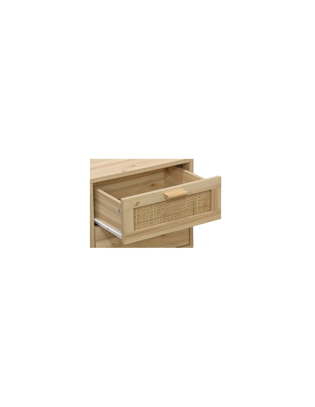 Mesilla de noche con patas 2 cajones con guias metálicas 1 cajón con frente en rattan decorativo Papel laminado Patas en madera Medidas: 40 x 39 x 48 cm - Unidad venta : caja 1 Ud - Volumen : 0 026 M 3 x Ud Entradas previstas : Colores disponibles : Fresno En stock : 77 Uds En stock : 77 Uds