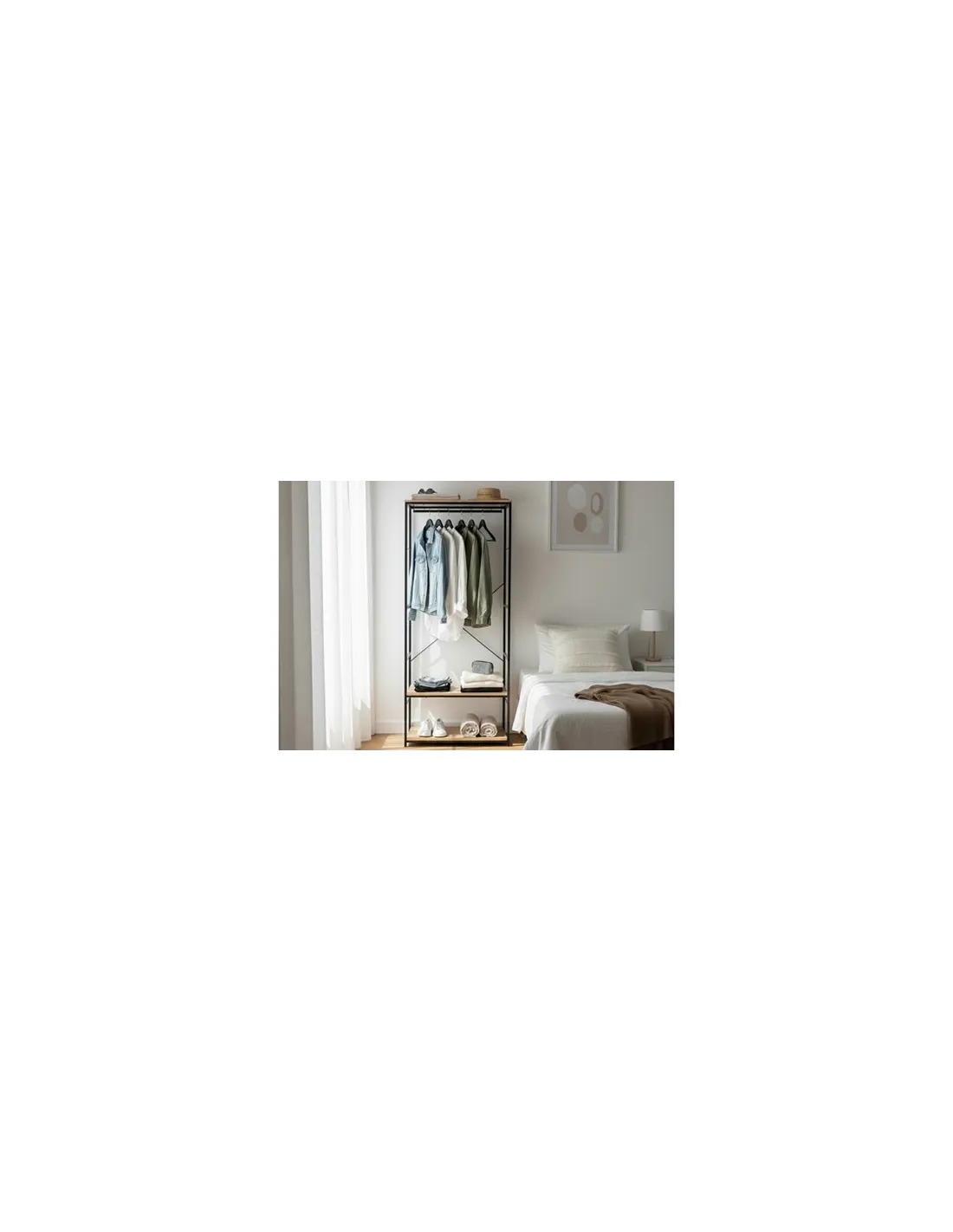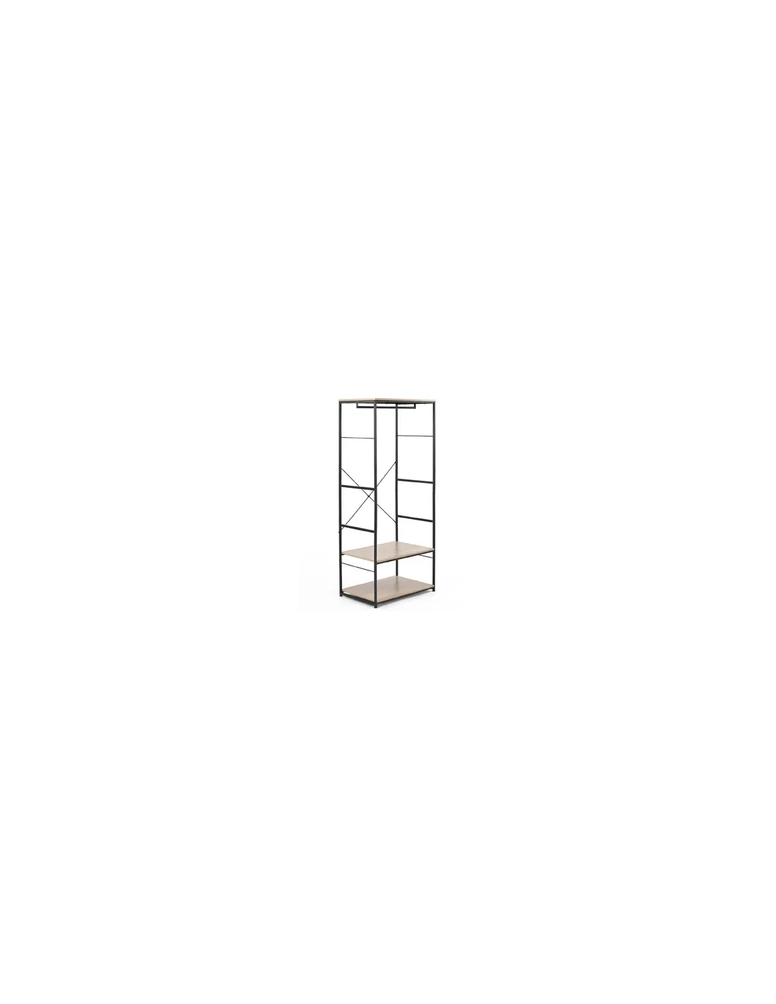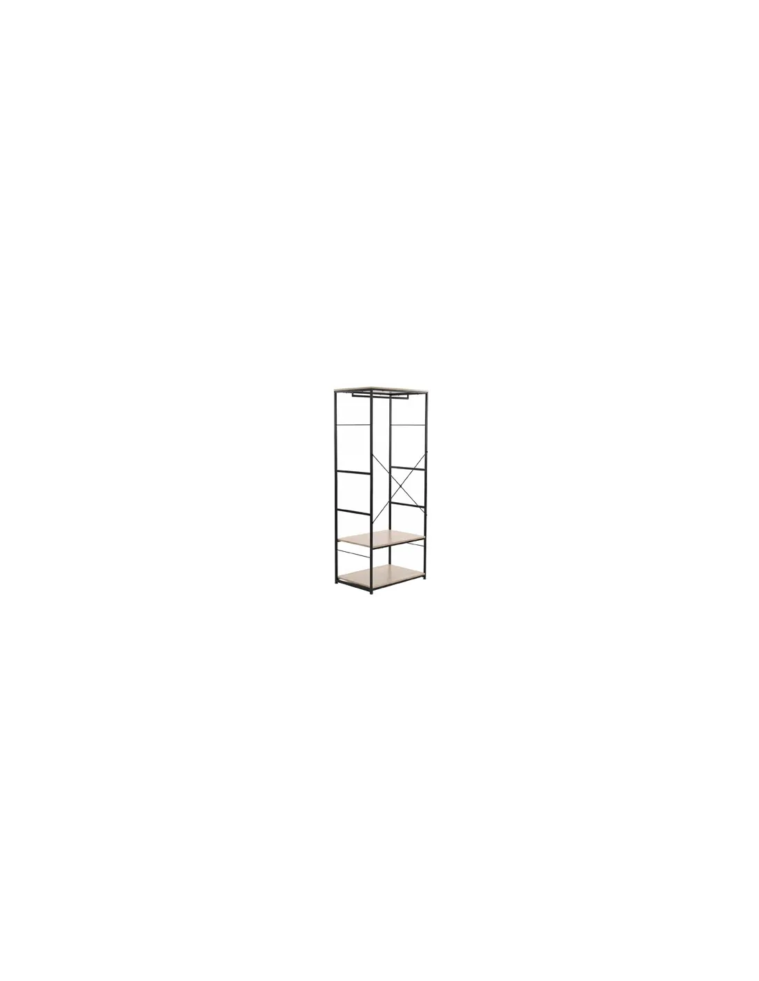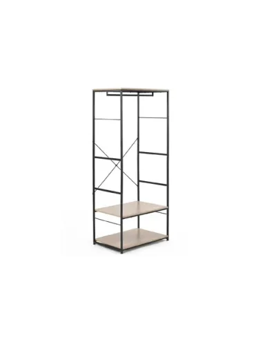 Armario abierto con 2 estantes y barra de colgar Estantes en melamina color roble Estructura metálica color negro Medidas : 75 x 50 x 180 cm - Unidad venta : caja 1 Ud - Volumen : 0 006 M 3 x Ud Entradas previstas : 76 Ud(s) - 08/03 Colores disponibles : Oak / Negro 76 Ud(s) - 08/03 76 Ud(s) - 08/03