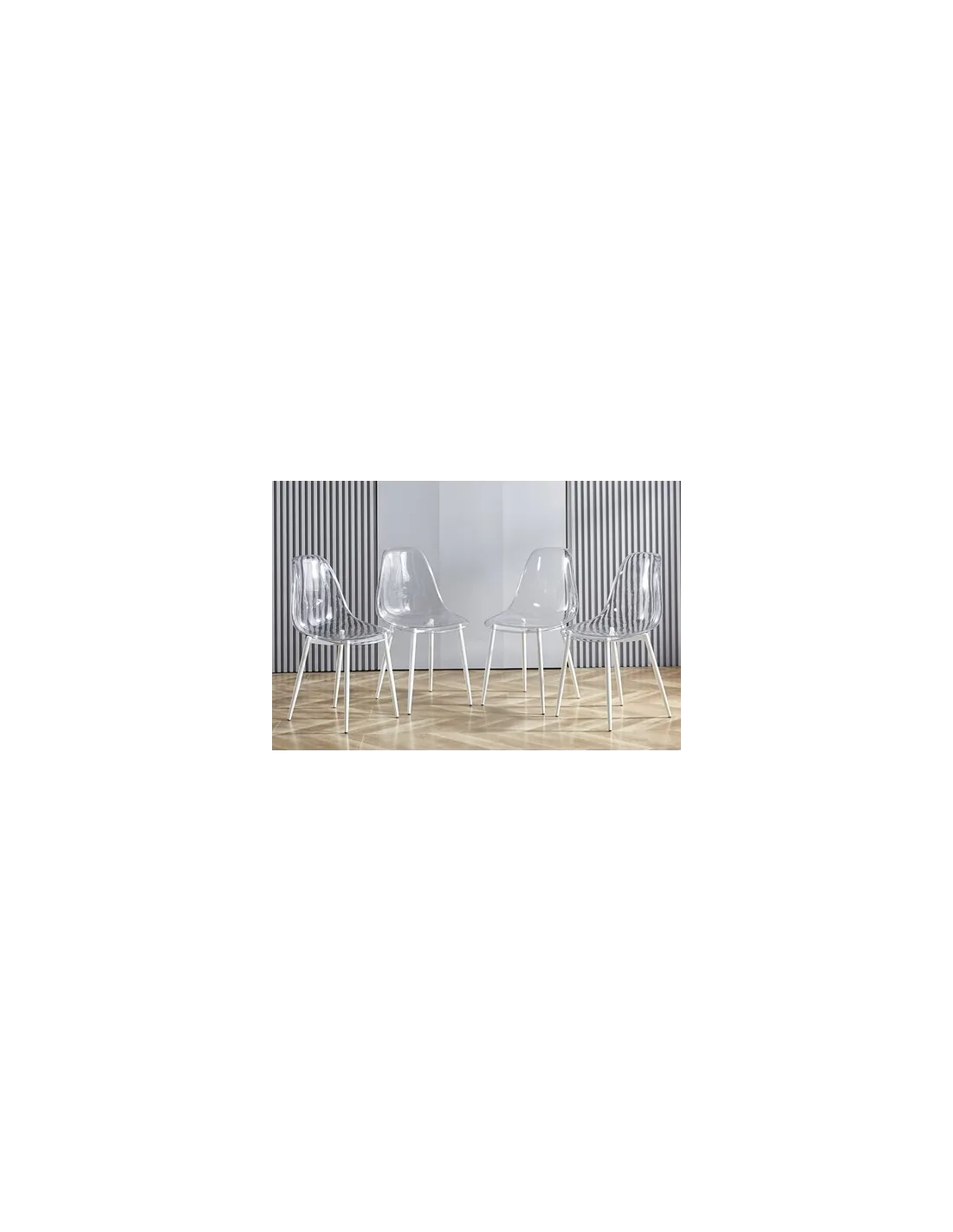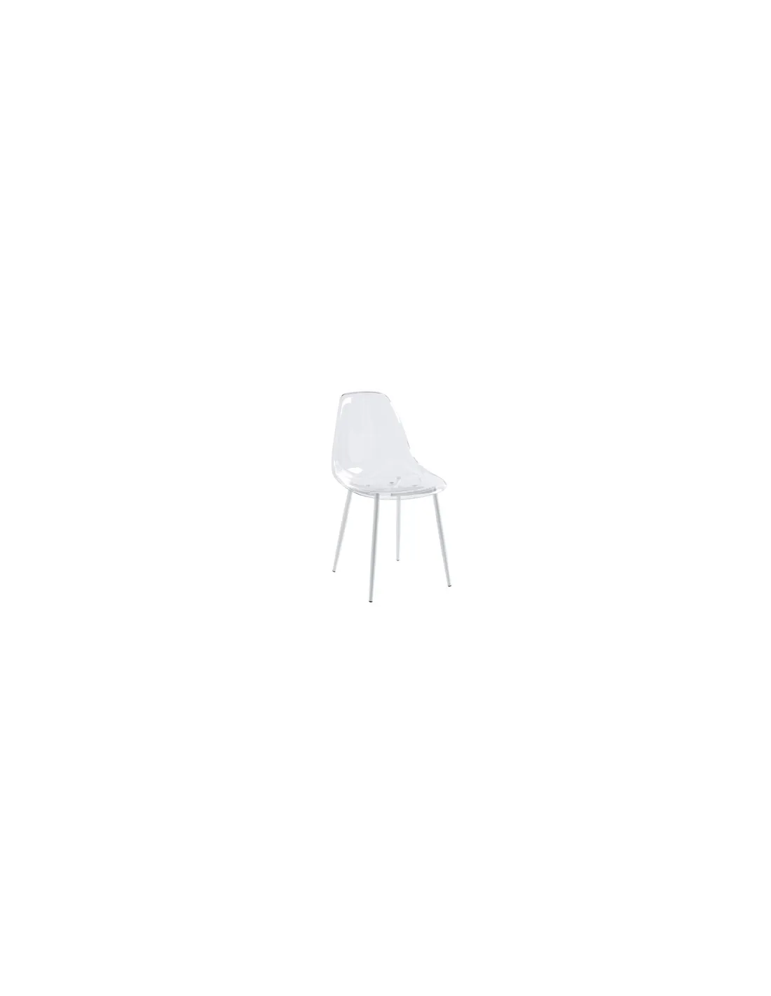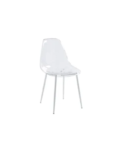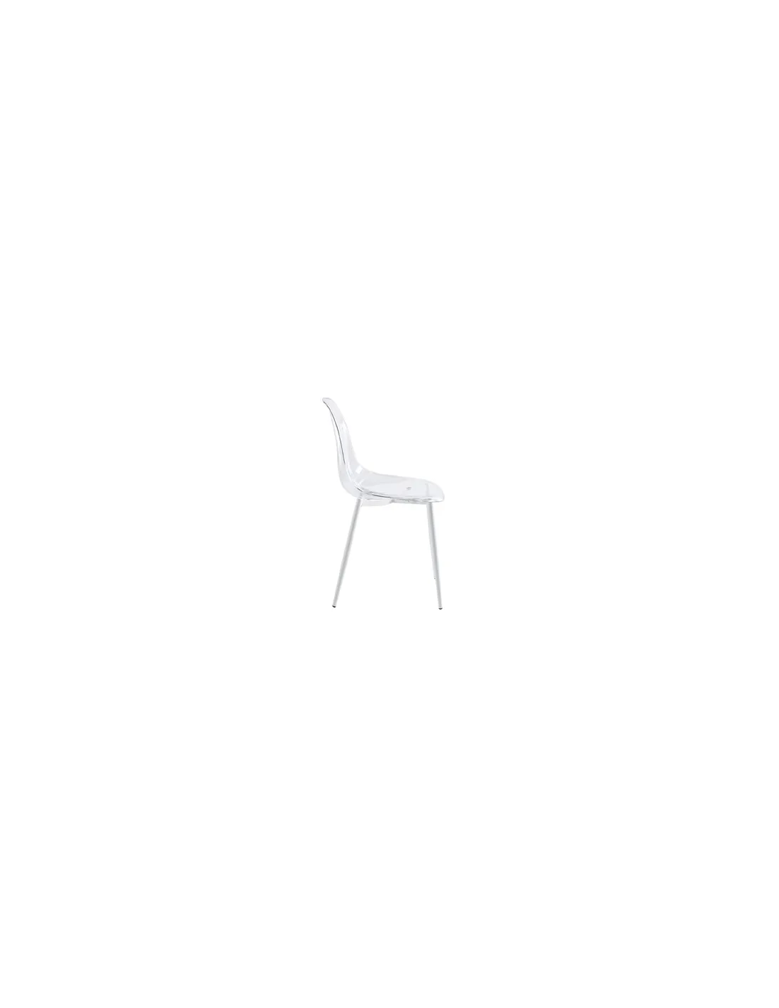 Carcasa de asiento y respaldo en PET transparente Estructura de patas metálica en color blanco Medidas: 46,5 x 50 x 85 cm - Unidad venta : caja 4 Uds - Volumen : 0 05 M 3 x Ud Entradas previstas : Colores disponibles : Transparente En stock : 40 Uds En stock : 40 Uds