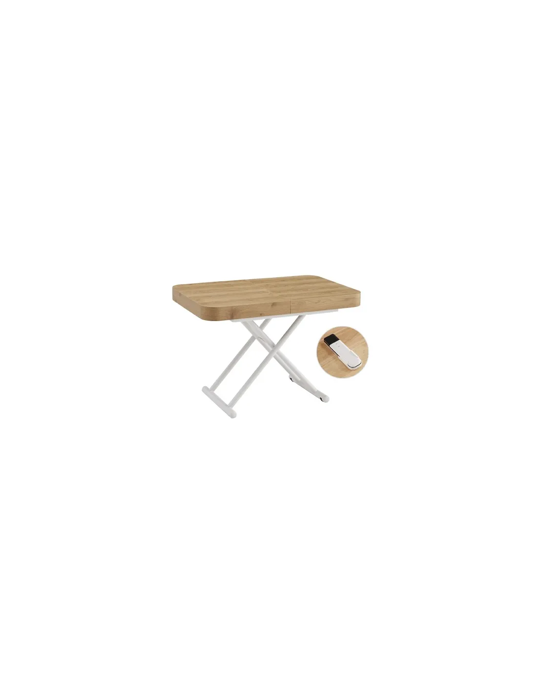 Mesa centro elevable y extensible Tapa y extensibles en melamina color oak 2 Extensibles independientes 40 cm bajo la tapa Estructura metálica color negro Elevacíon eléctrica con batería recargable Accionamiento mediante mando a distancia Medidas : 120 - 160 - 200 x 75 x 28 - 78 cm - Unidad venta : caja 1 Ud - Volumen : 0 358 M 3 x Ud Entradas previstas : 48 Ud(s) - 22/04 Colores disponibles : Oak / Negro 51 Ud(s) - 22/04 Oak / Blanco 48 Ud(s) - 22/04 51 Ud(s) - 22/04