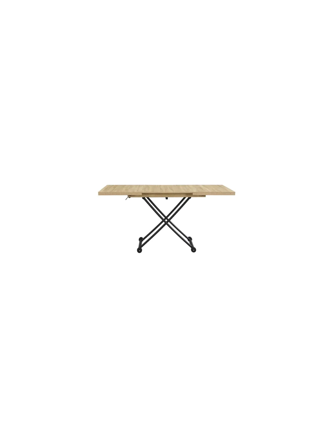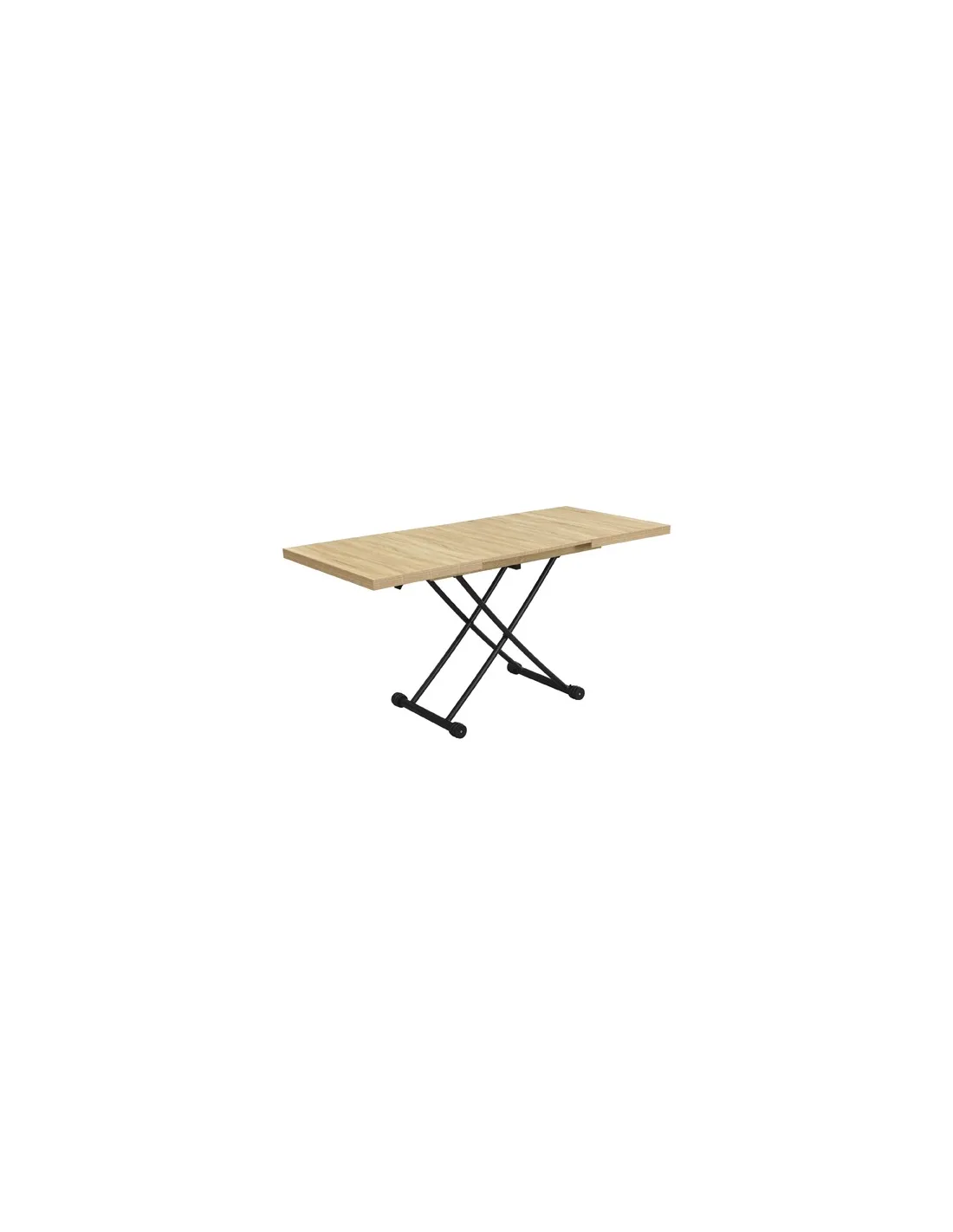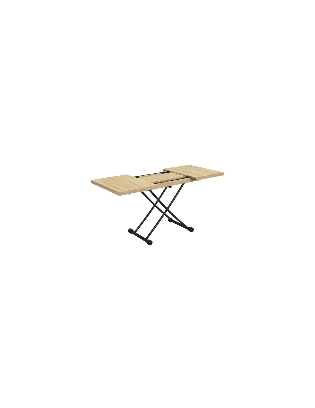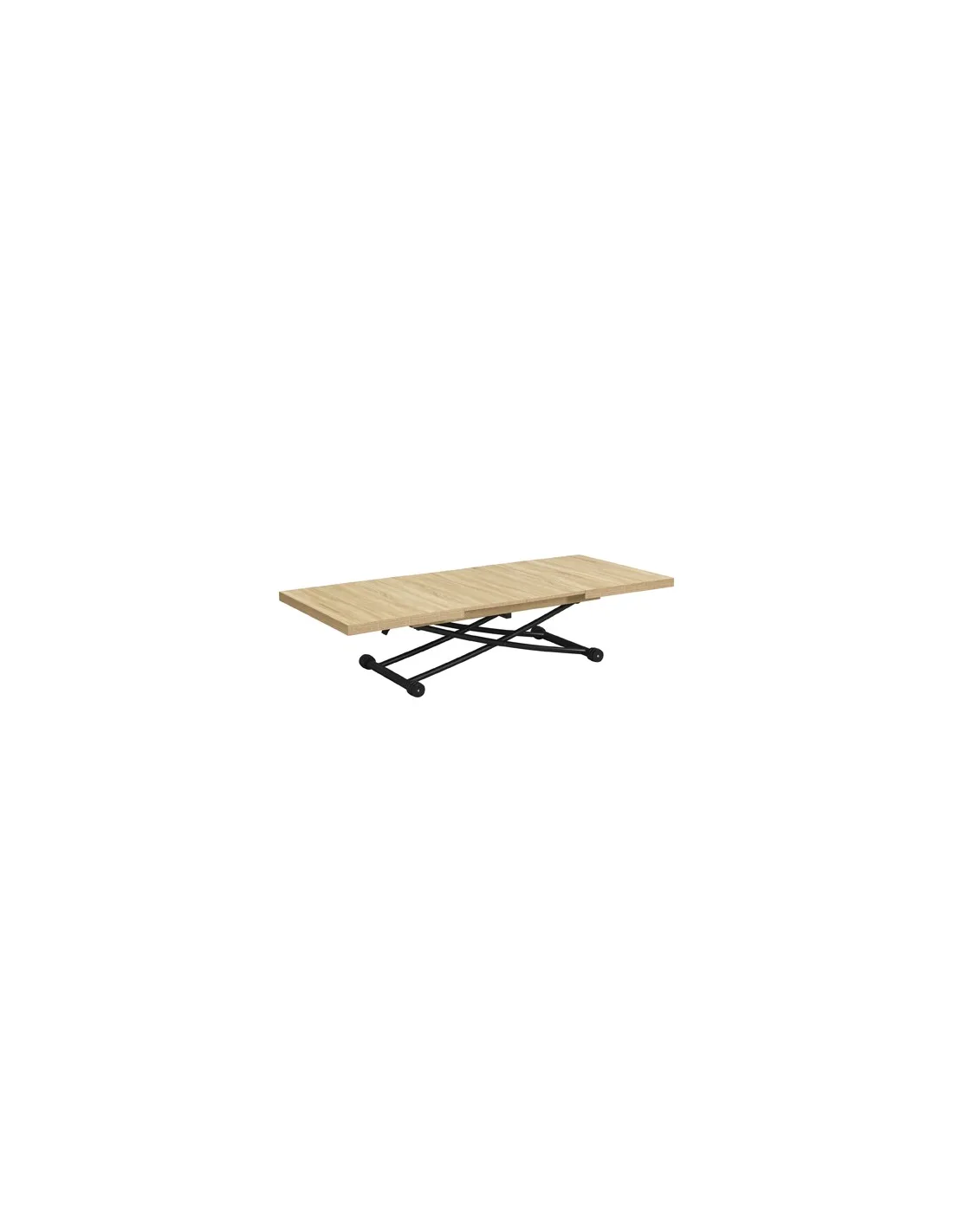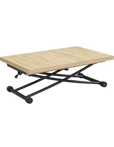 Mesa centro elevable y extensible Tapa y extensibles en melamina 2 Extensibles independientes 30 cm bajo la tapa Elevacíon a gas Accionamiento mediante tirador Estructura metálica color negro Medidas : 100 - 130 - 160 x 80 x 28 - 75 cm - Unidad venta : caja 1 Ud - Volumen : 0 149 M 3 x Ud Entradas previstas : 100 Ud(s) - 29/03 Colores disponibles : Oak / Negro 100 Ud(s) - 29/03 100 Ud(s) - 29/03