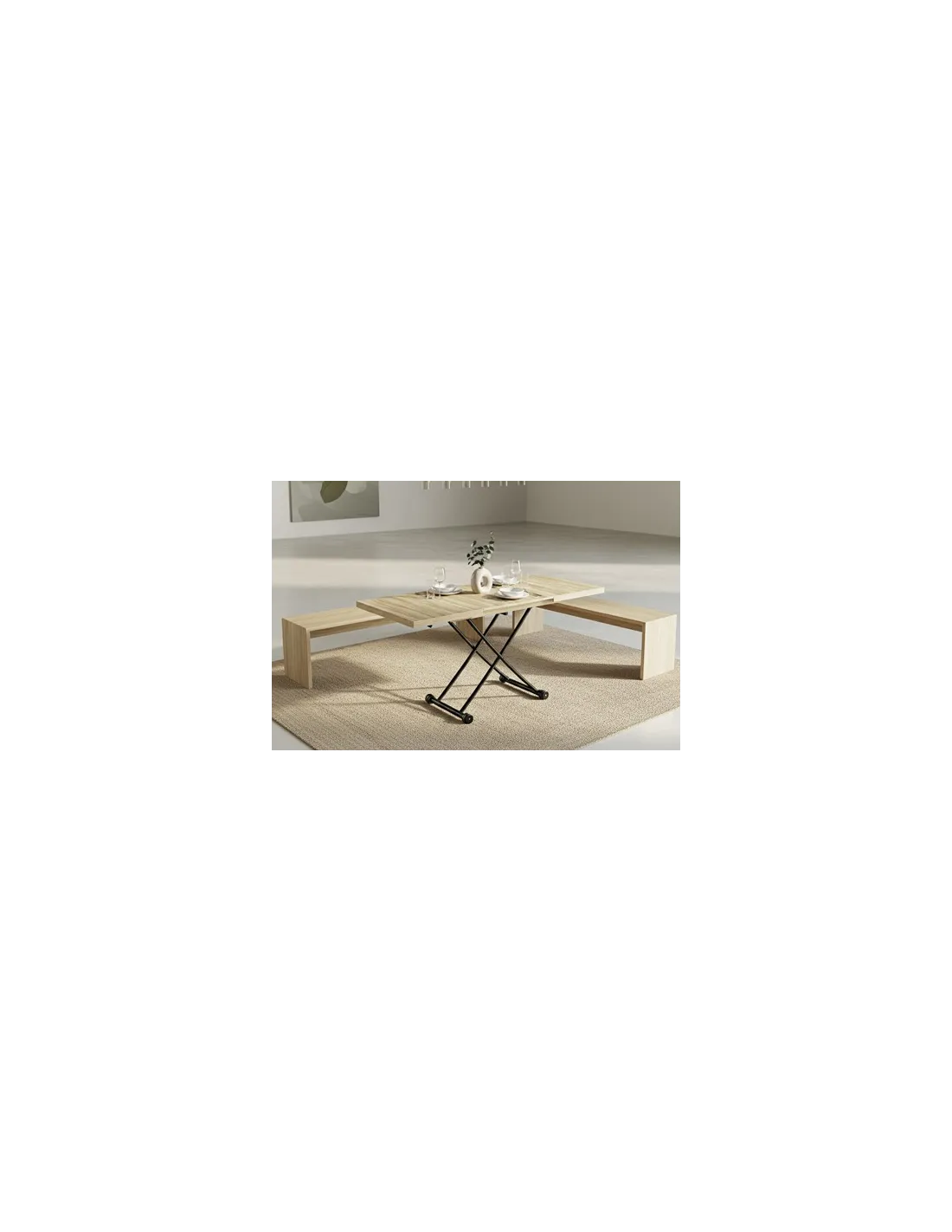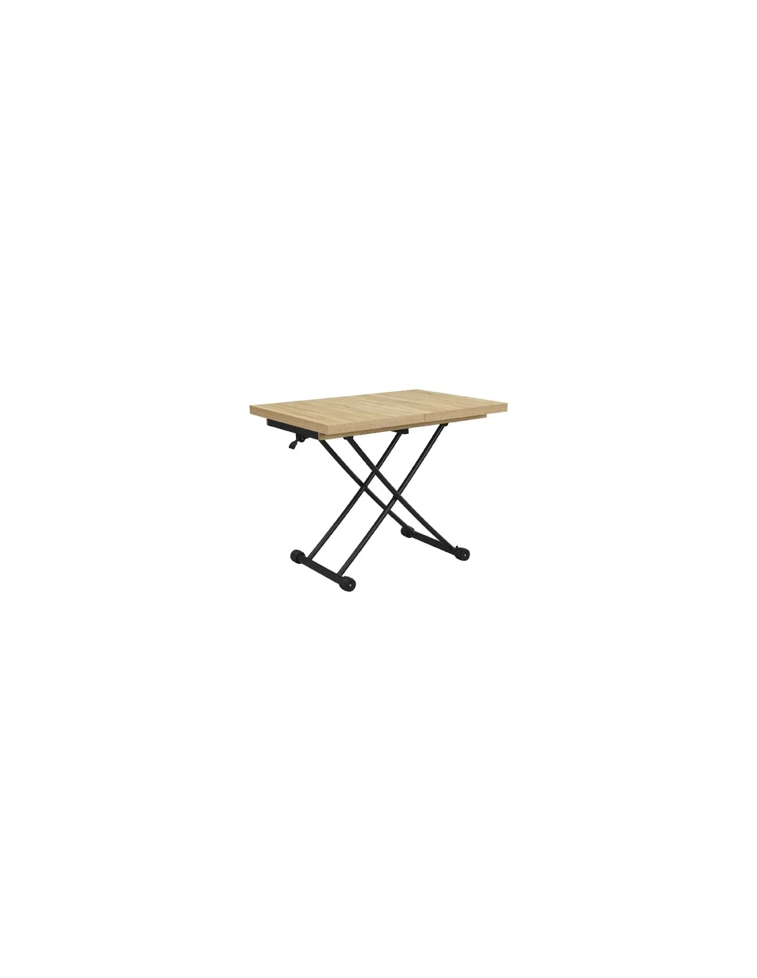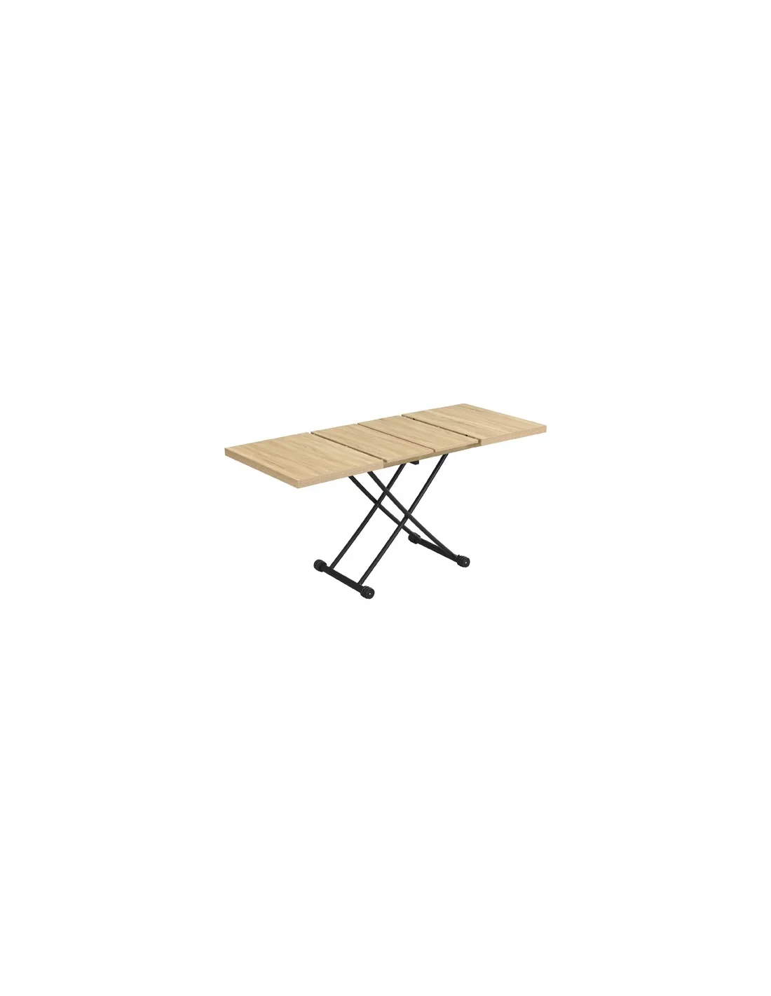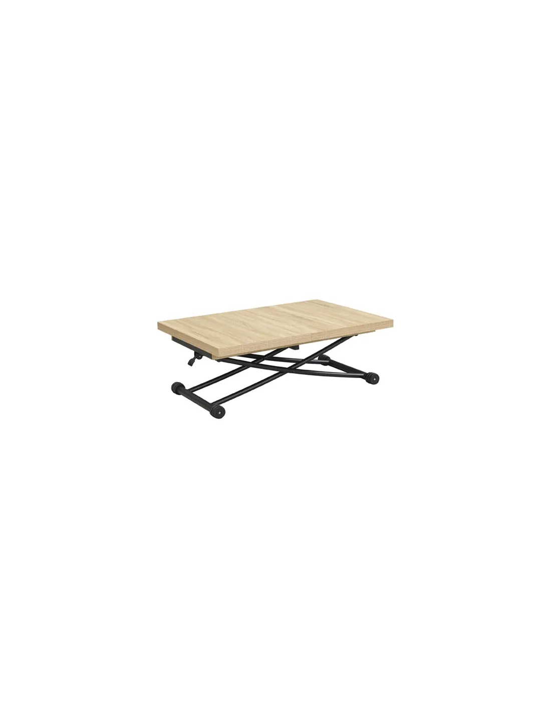 Mesa centro elevable y extensible Tapa y extensibles en melamina 2 Extensibles independientes 30 cm bajo la tapa Elevacíon a gas Accionamiento mediante tirador Estructura metálica color negro Medidas : 100 - 130 - 160 x 80 x 28 - 75 cm - Unidad venta : caja 1 Ud - Volumen : 0 149 M 3 x Ud Entradas previstas : 100 Ud(s) - 29/03 Colores disponibles : Oak / Negro 100 Ud(s) - 29/03 100 Ud(s) - 29/03
