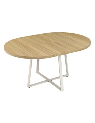 Mesa comedor redonda extensible Extensible hasta 160 cm Almacenamiento de extensible bajo la tapa Tapa en MDF 20 mm grosor y papel laminado 3D Grosor borde tapa 40 mm Patas metálicas color blanco Medidas: 110 - 160 x 110 x 76 cm - Unidad venta : caja 1 Ud - Volumen : 0 272 M 3 x Ud Entradas previstas : 7 Ud(s) - 14/04 Colores disponibles : Oak / Negro 4 Ud(s) - 14/04 Oak / Blanco 7 Ud(s) - 14/04 4 Ud(s) - 14/04