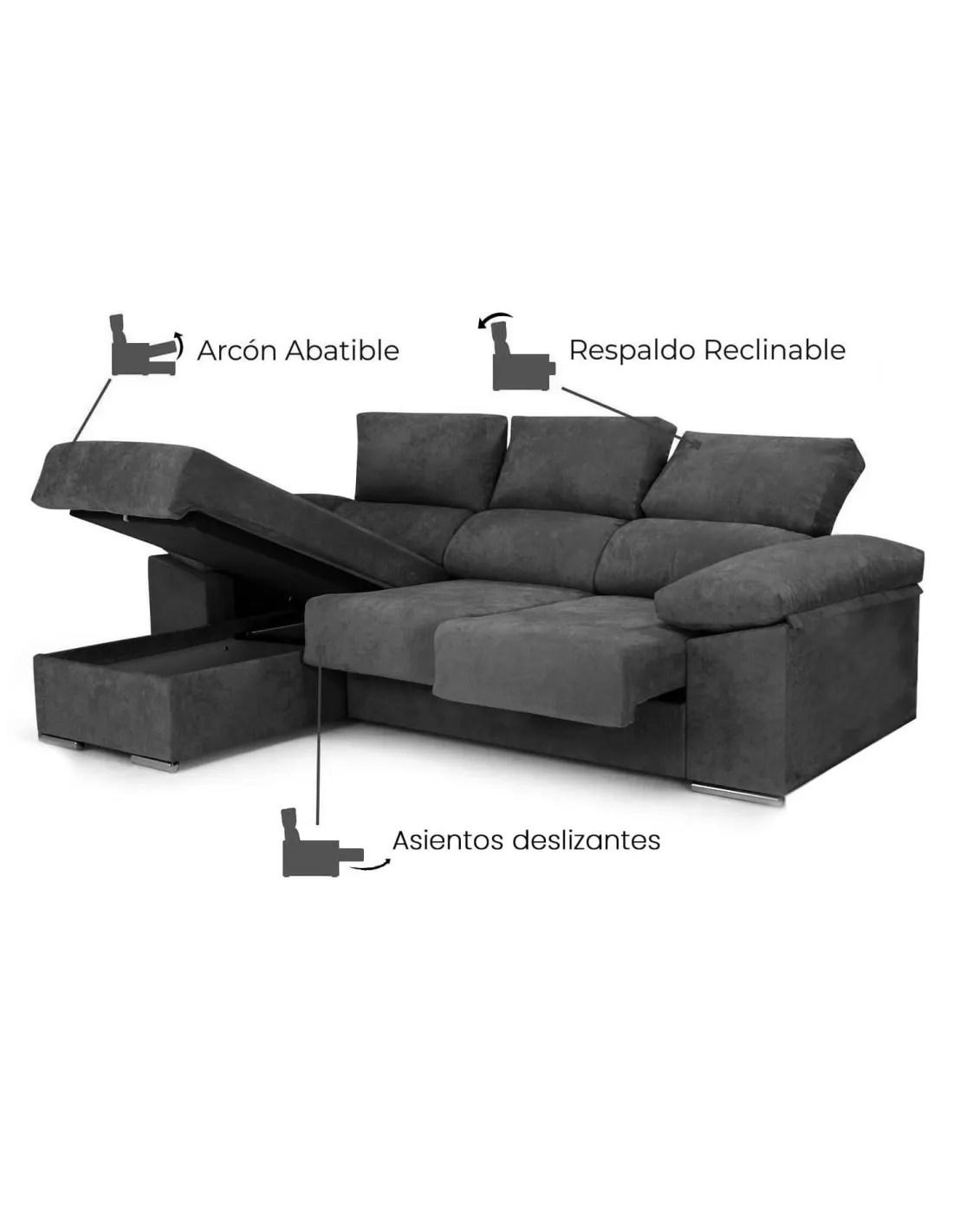 Disfruta la comodidad que ofrece nuestro sofá chaise longue confeccionado con tejido de gran calidad. Este chaiselonge se compone de asientos reclinables para que puedas ajustar la altura del cabecero y así evitar molestias cervicales.
