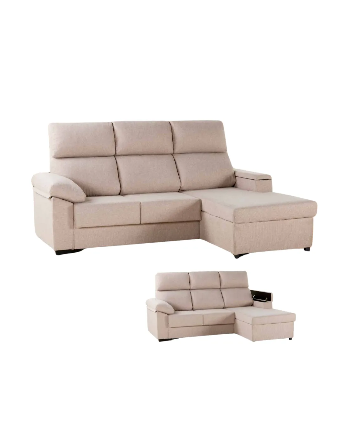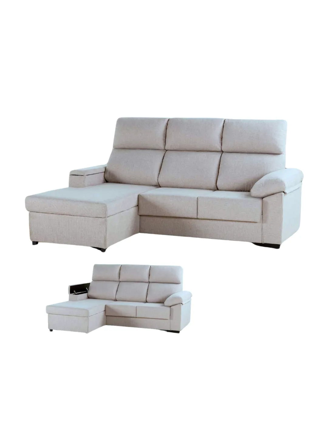 Su estructura de madera de pino garantiza resistencia y durabilidad, mientras que sus cojines de asiento de alta densidad y respaldo de fibra hueca siliconada ofrecen un descanso excepcional. Diseñado para adaptarse a tu espacio, es reversible y cuenta con un práctico arcón de almacenamiento en el brazo derecho, ideal para mantener el orden en tu hogar.